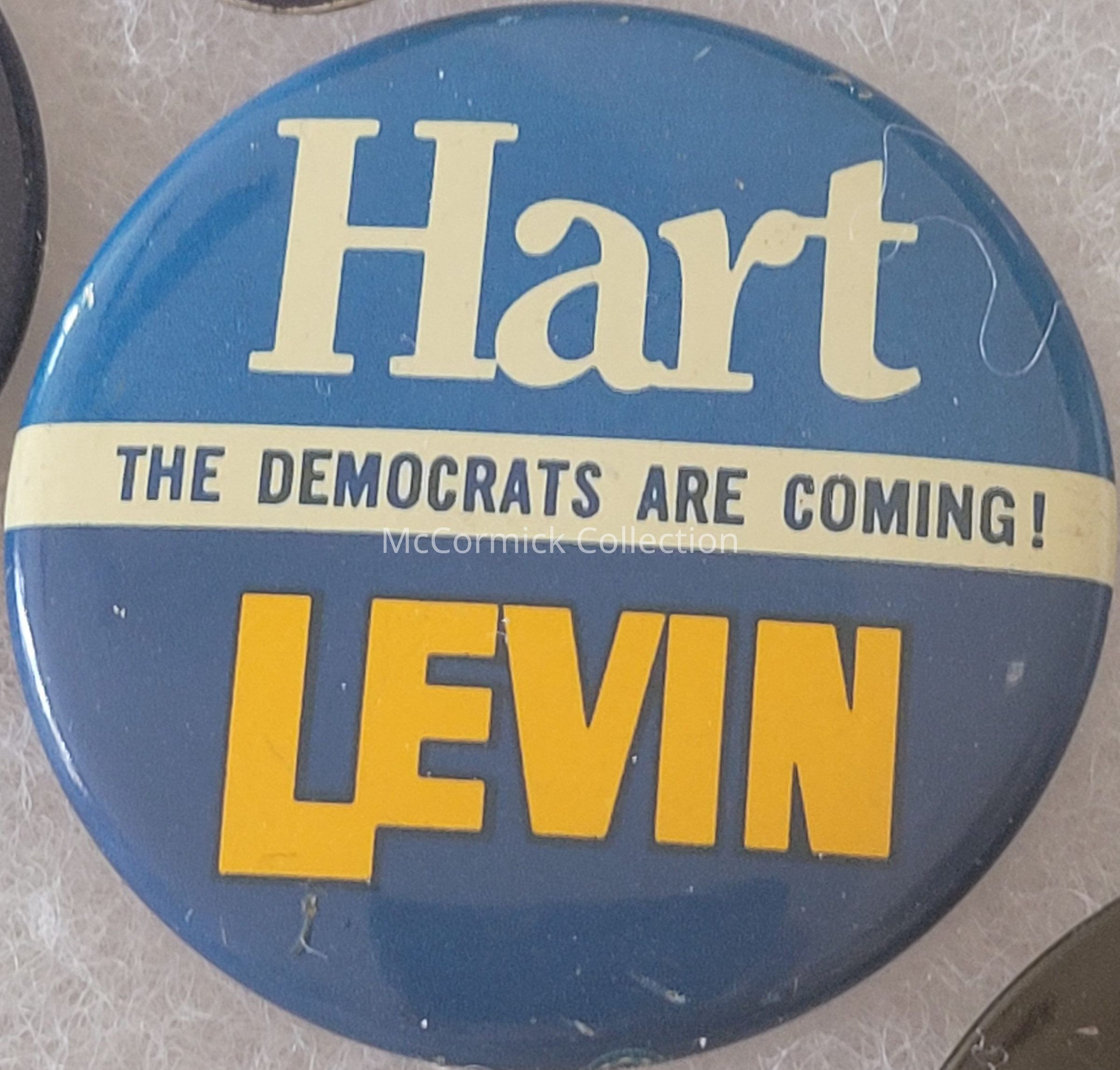 A 1.75" political button for Philip A. Hart for U.S. Senate and Sander Levin for Governor, 1970, with "The Democrats are Coming!" slogan.