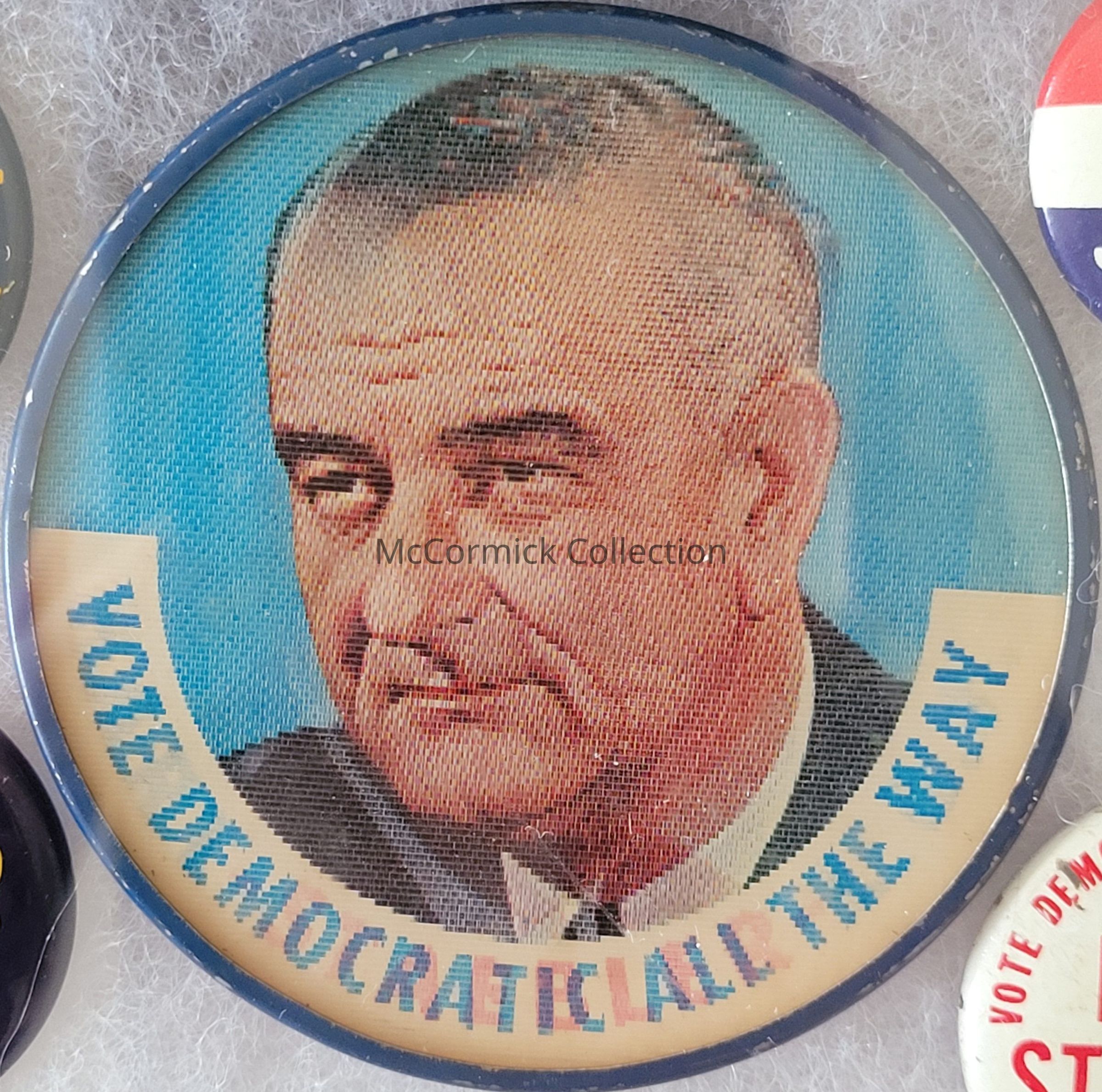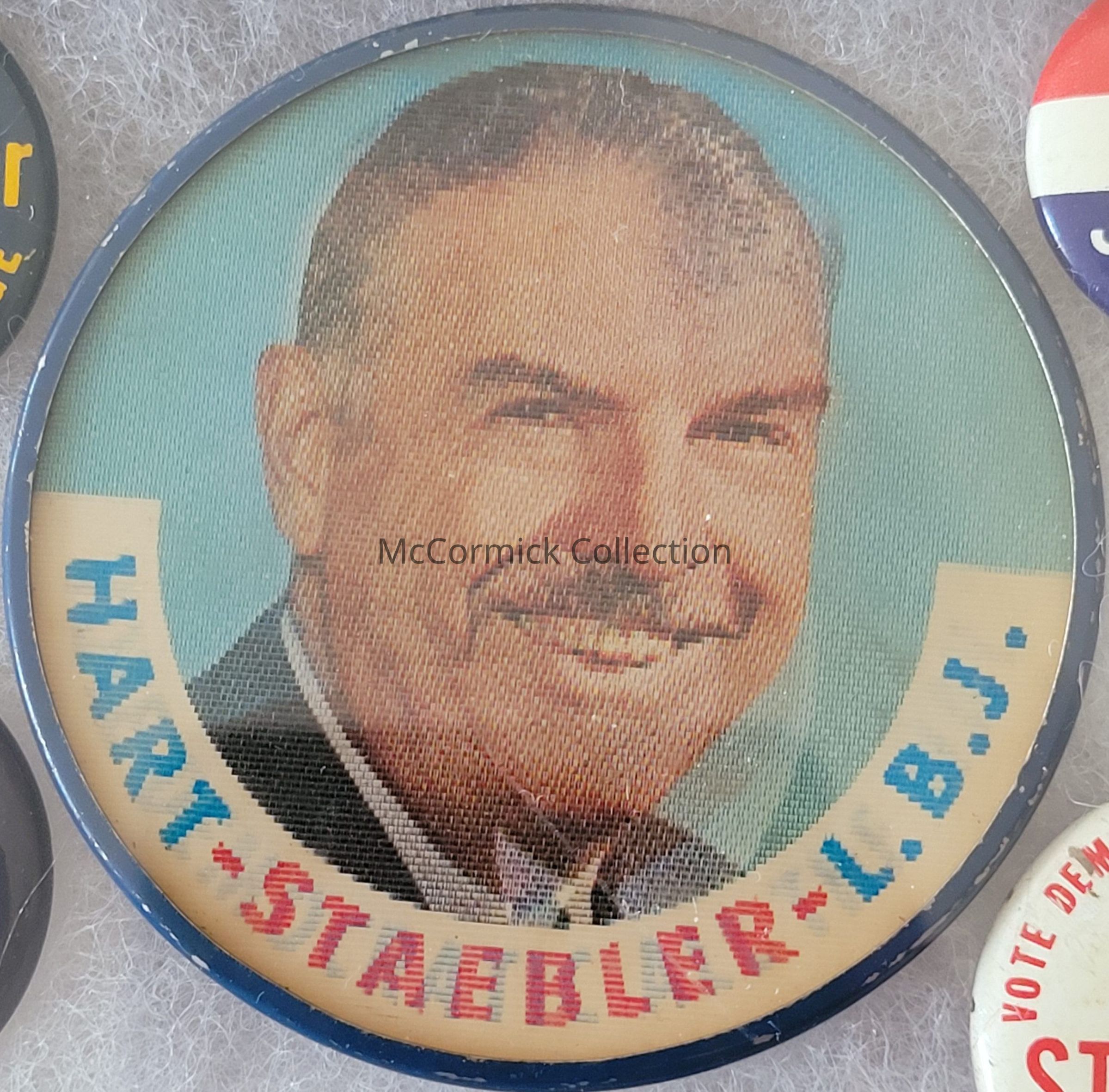 A 2.5" color political coattail flasher button featuring the likeness of Neil Staebler and Lyndon B. Johnson, slogan is "Hart-Staebler-LBJ / Vote Democratic All the Way." For Philip A. Hart for U.S. Senator, Neil Staebler for Governor, and Lyndon B. Johnson for President, 1964.