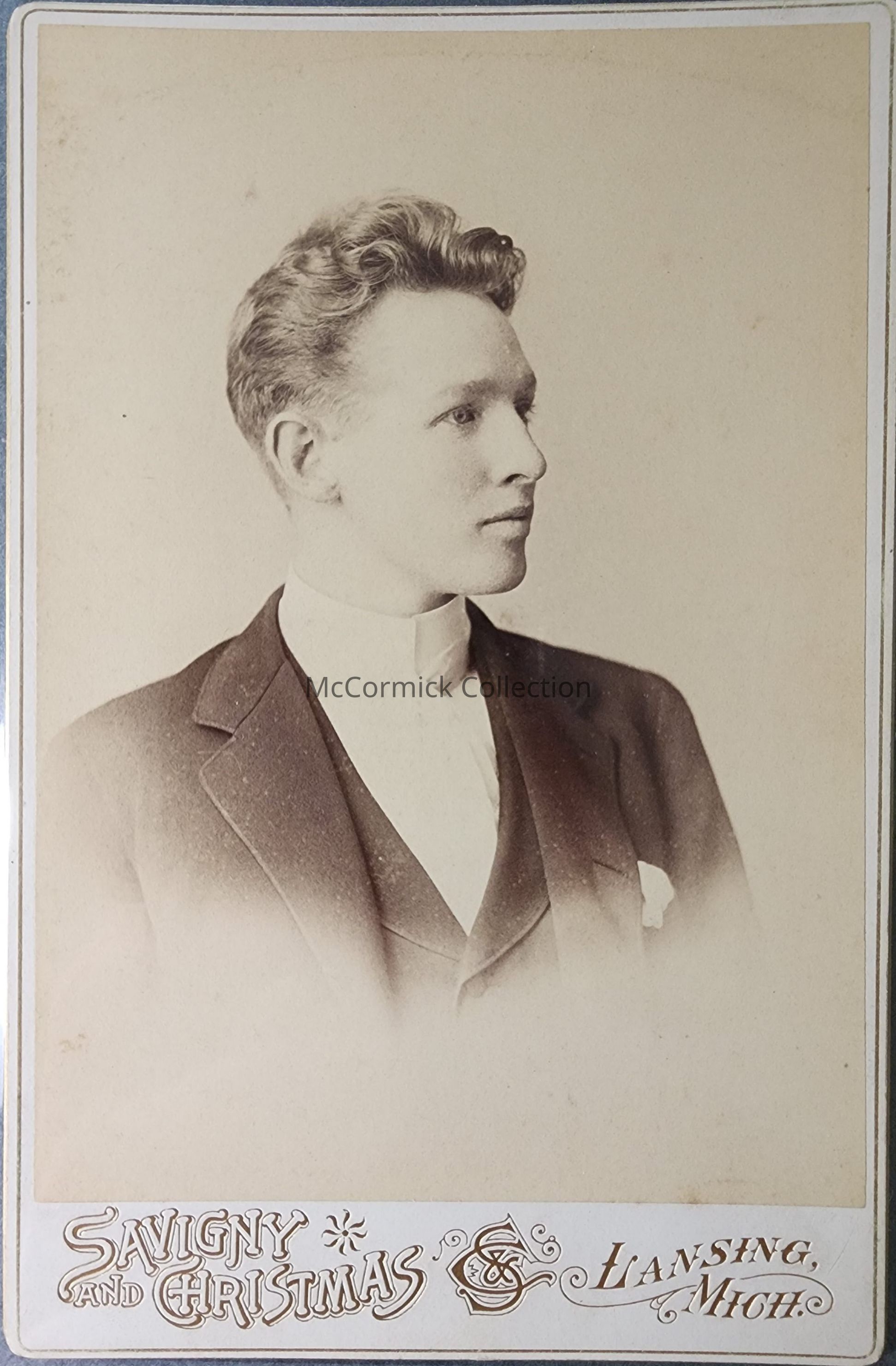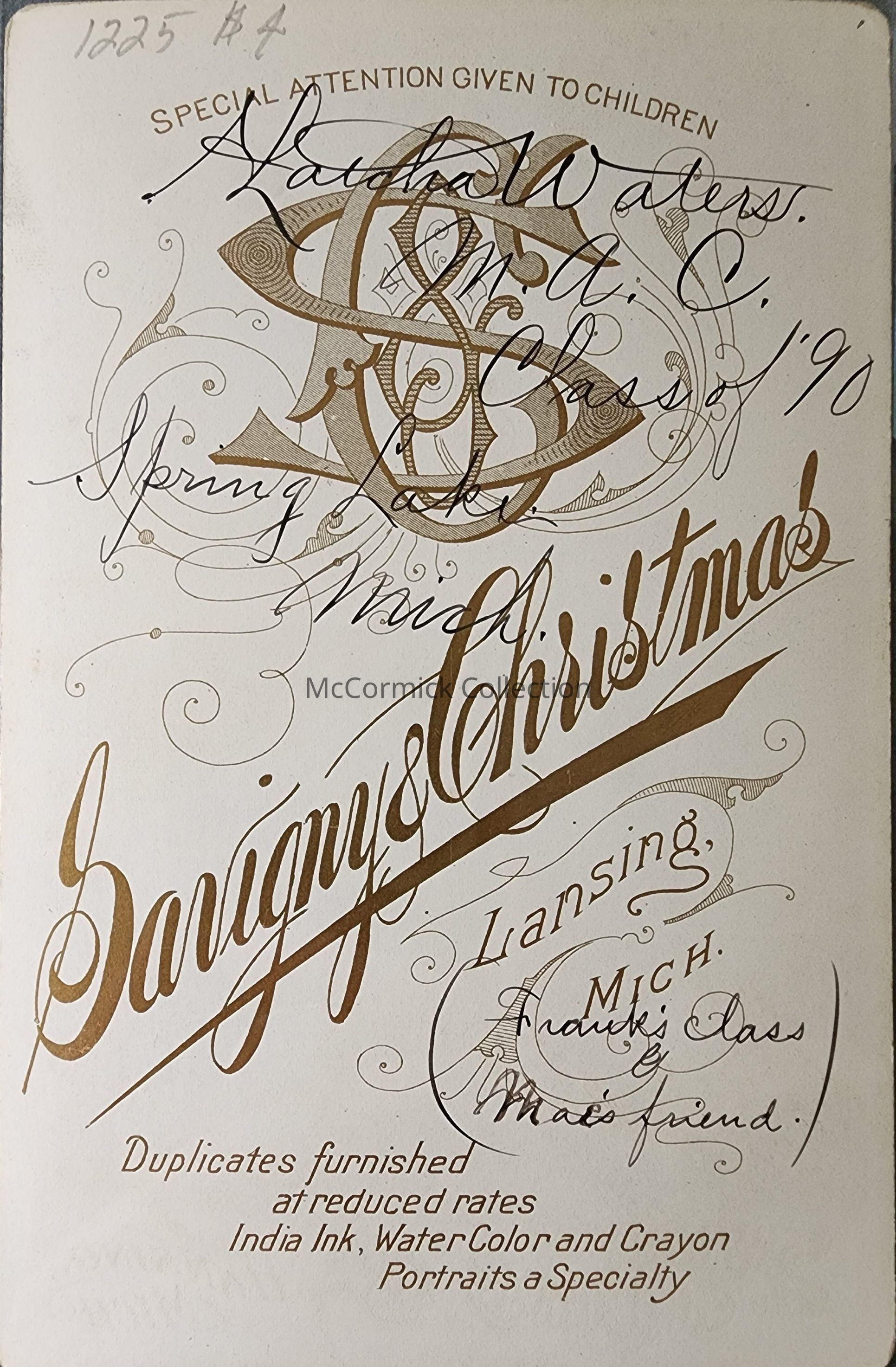 Cabinet card photograph of Hatcha (sic) Waters of Spring Lake, Michigan, student at MAC Class of 1890. Photo by Savigny and Christmas.Made/Created