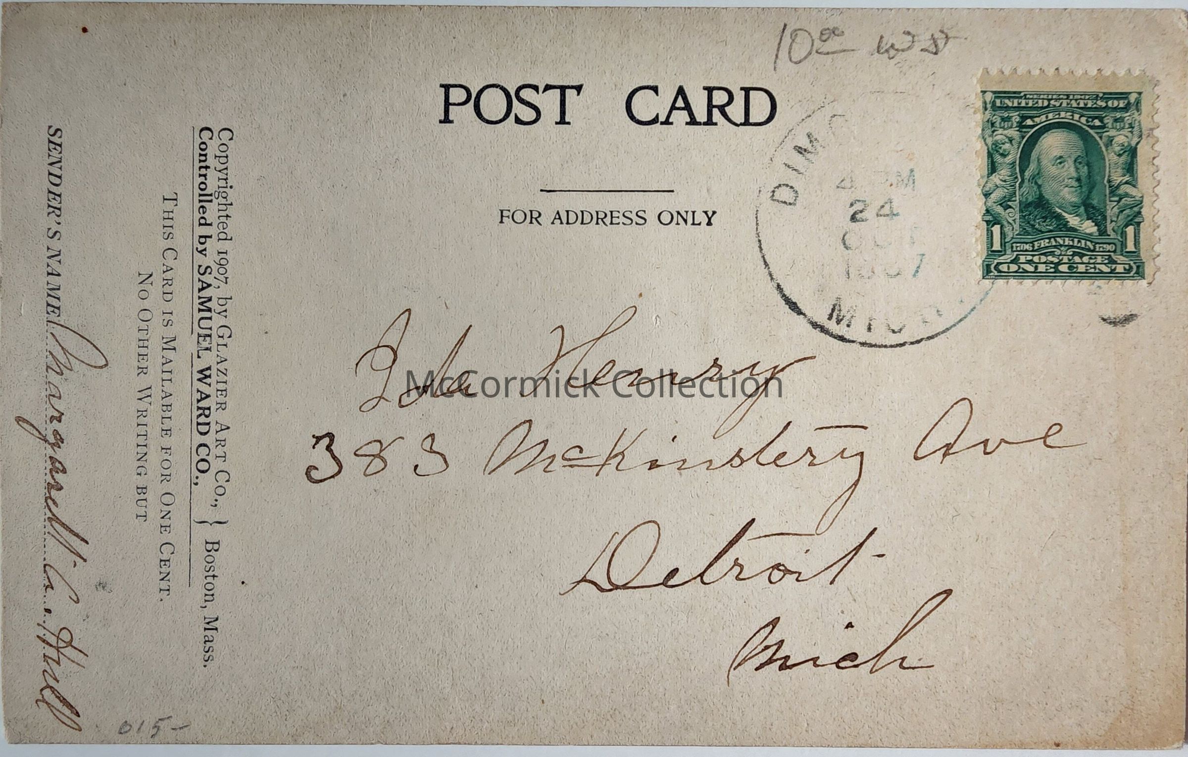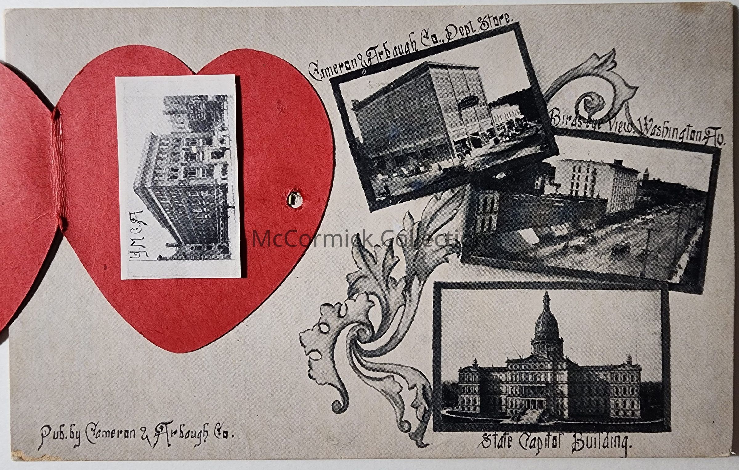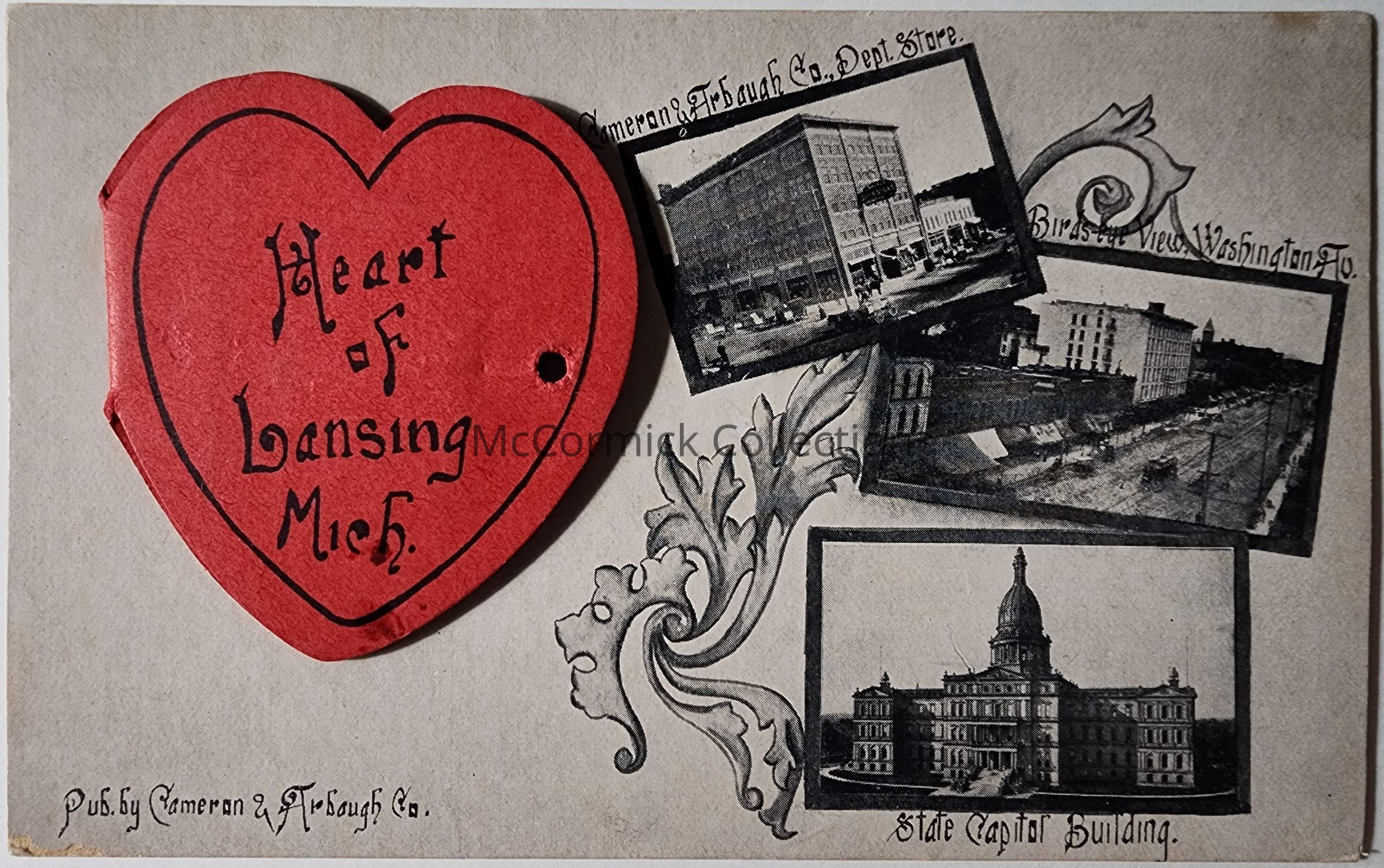 Postcard on thick cardstock. Published by the Cameron & Arbaugh Co. of Lansing. Features the Cameron and Arbaugh Department Store, Bird's Eye View of Washington, State Capitol, and YMCA. Postmarked Dimondale, circa 1900.