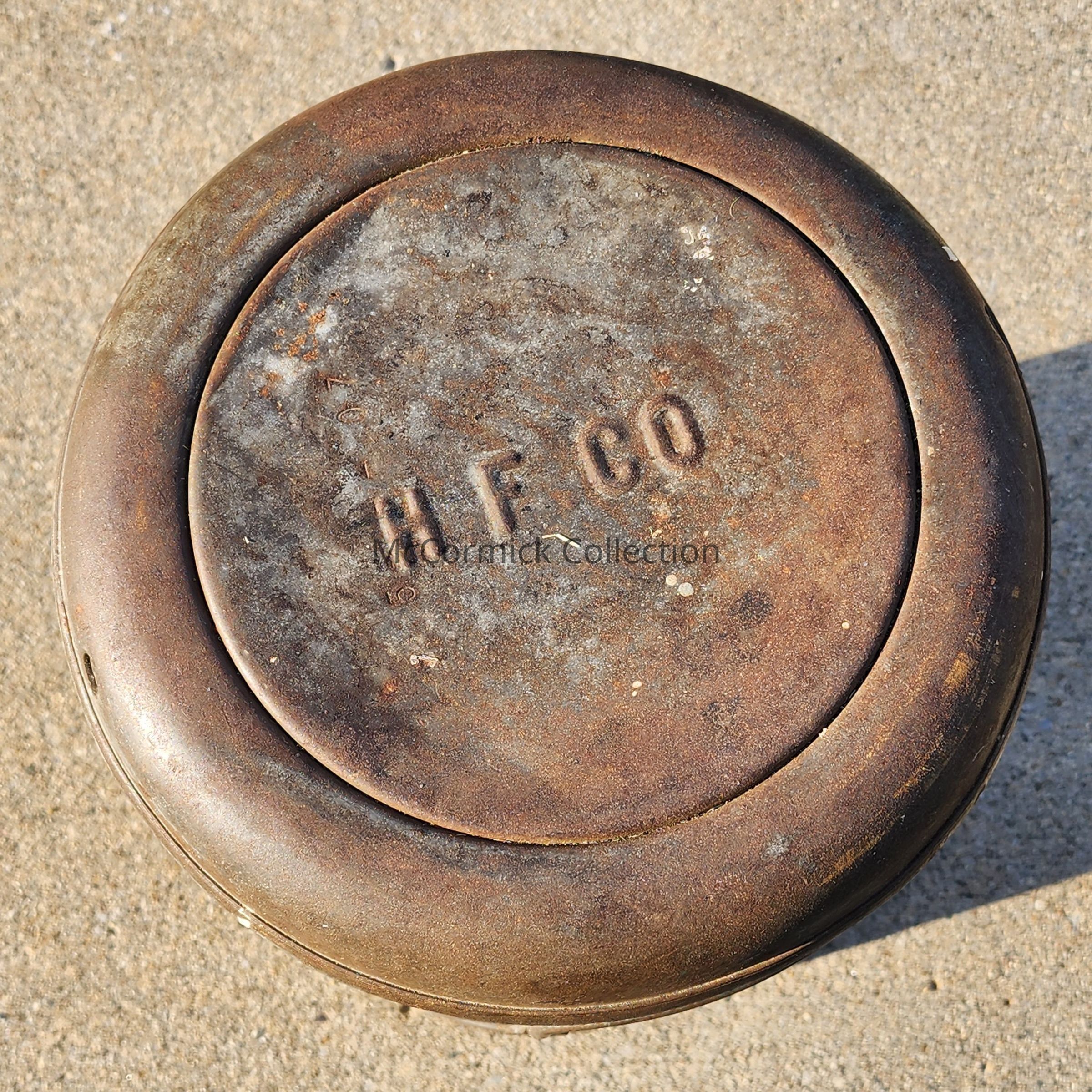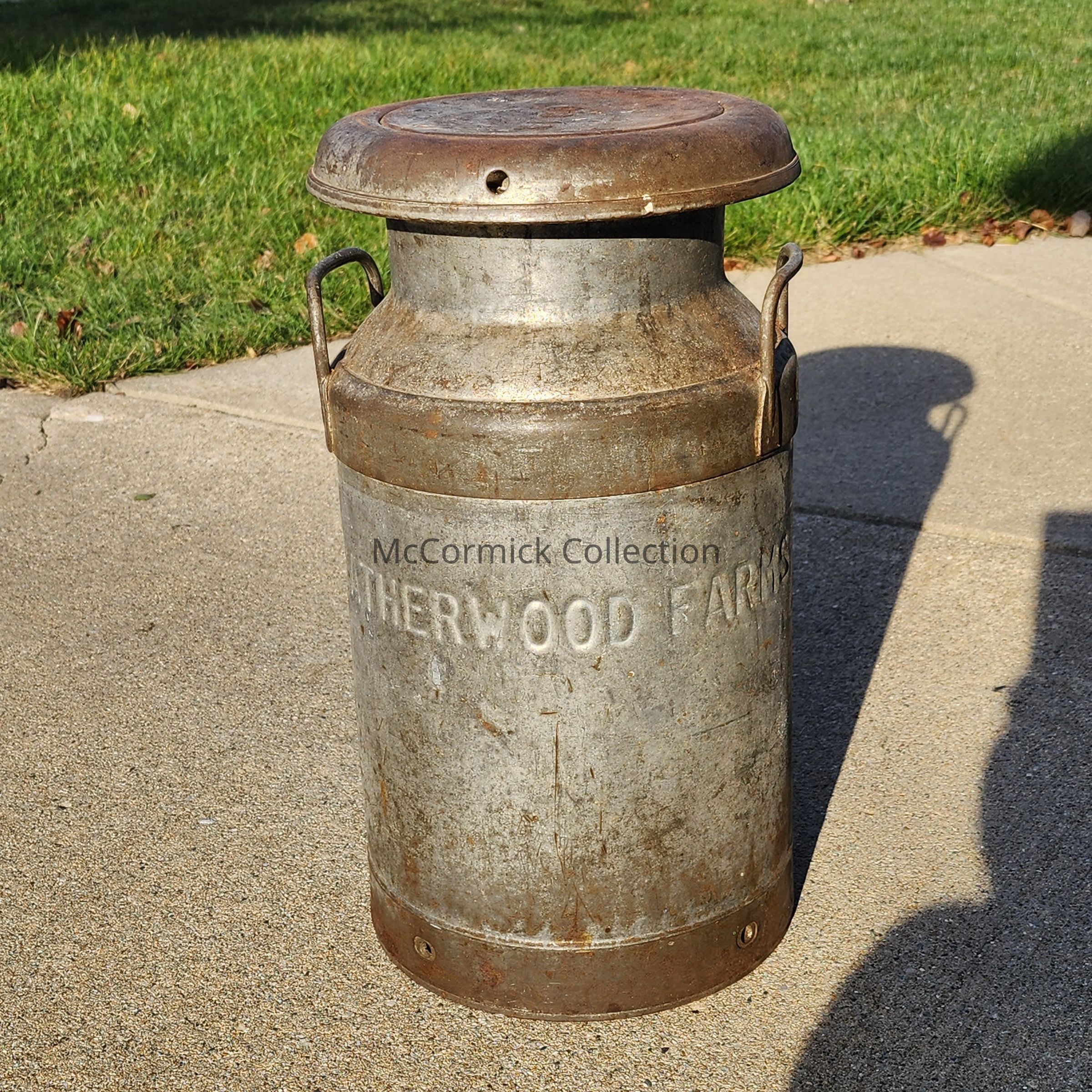A metal 3-gallon can from Heatherwood Farms of Lansing, Michigan.
