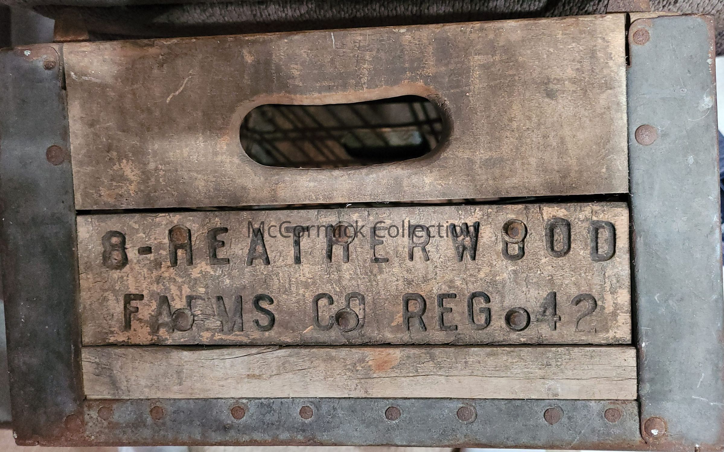 A large wood and metal crate for half pint bottles from Heatherwood Farms dairy in Lansing, Michigan, dated 1942.