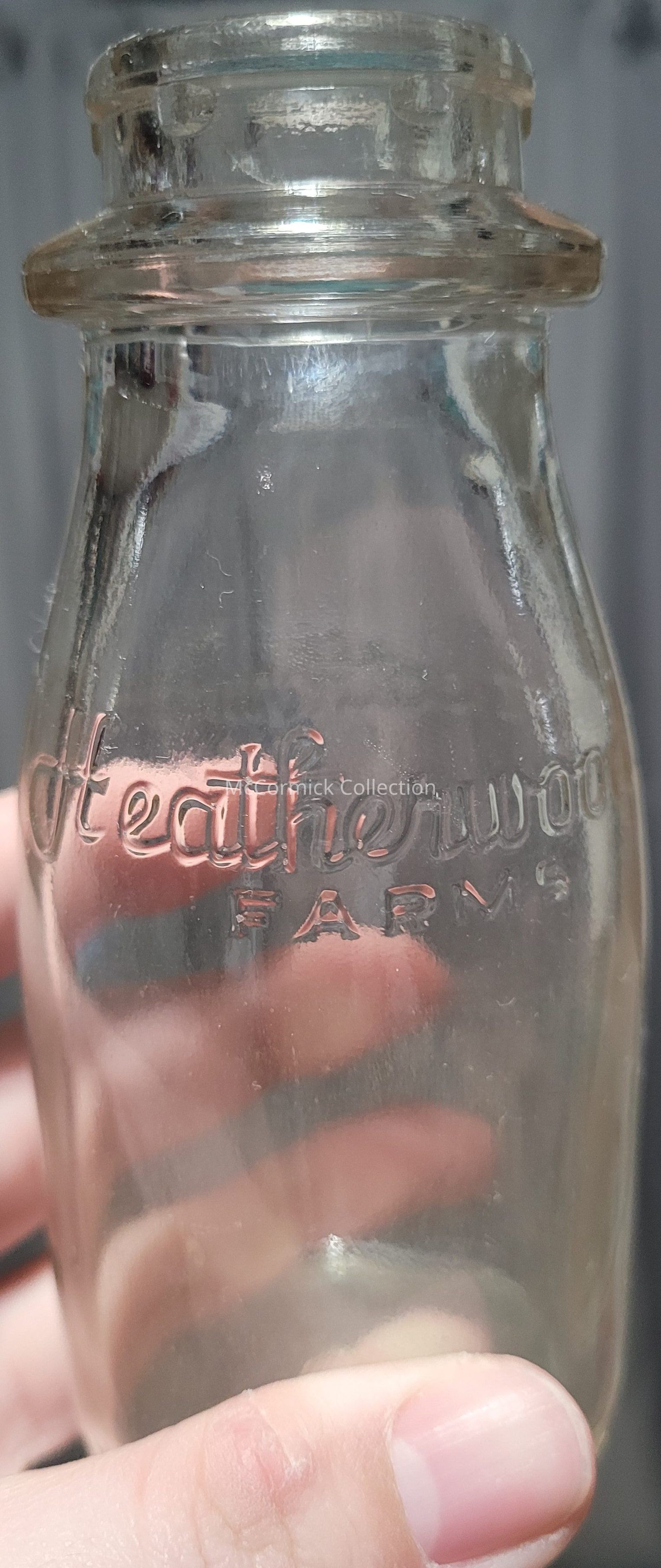 An embossed half pint bottle with script logo for Heatherwood Farms dairy of Lansing, Michigan.