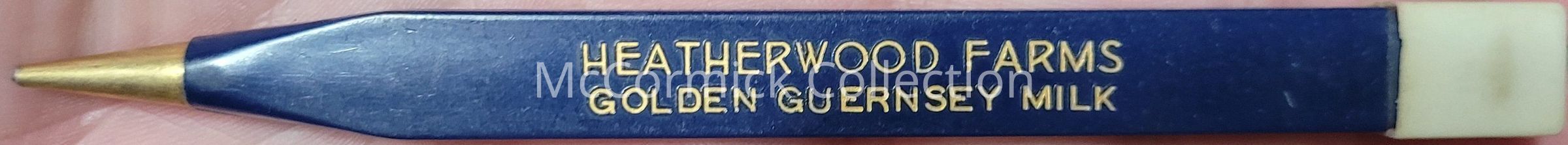 A blue and yellow mechanical pencil advertising for Heatherwood Farms dairy of Lansing, Michigan.