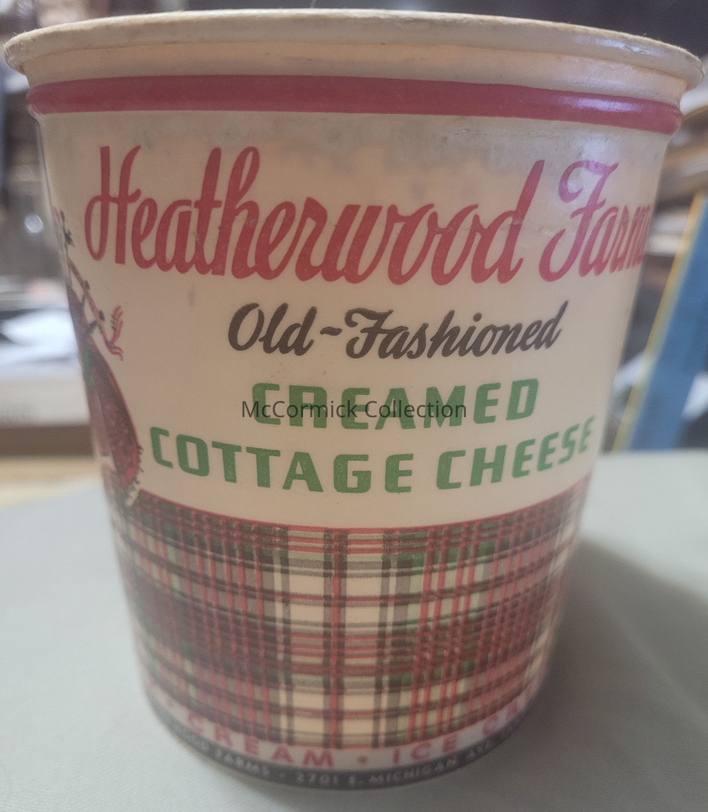 Circa 1960s container for Old-Fashioned Creamed Cottage Cheese from Heatherwood Farms of Lansing. Two of these in varying condition, one with lid and one without.