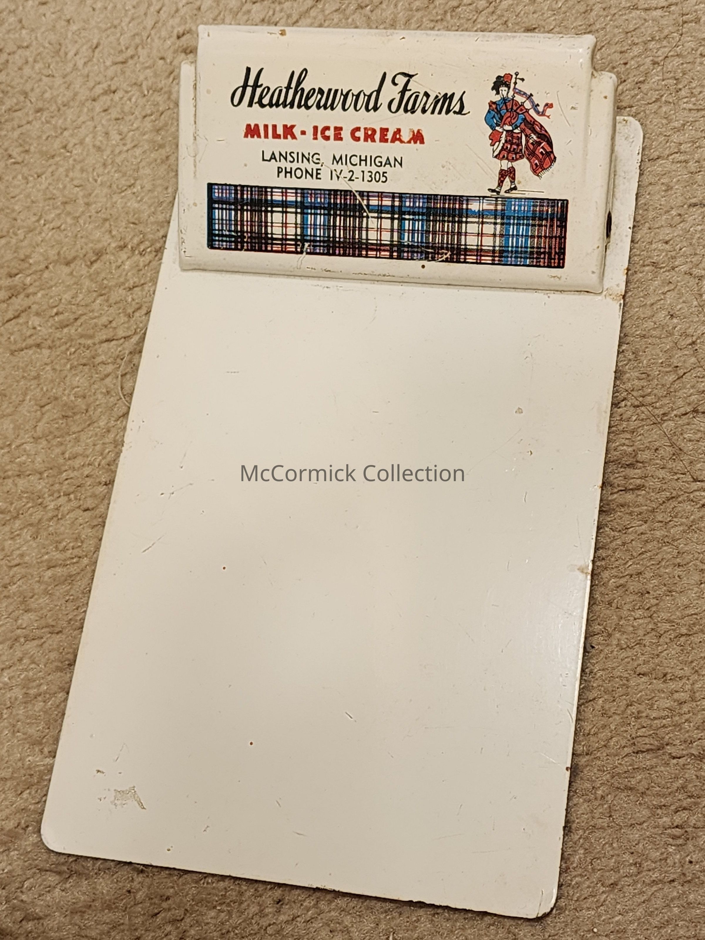 A porcelain and metal advertising clipboard from Heatherwood Farms dairy of Lansing, Michigan.