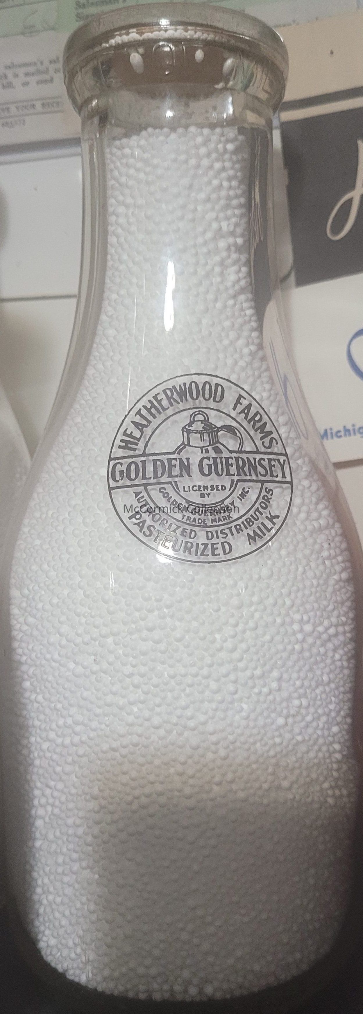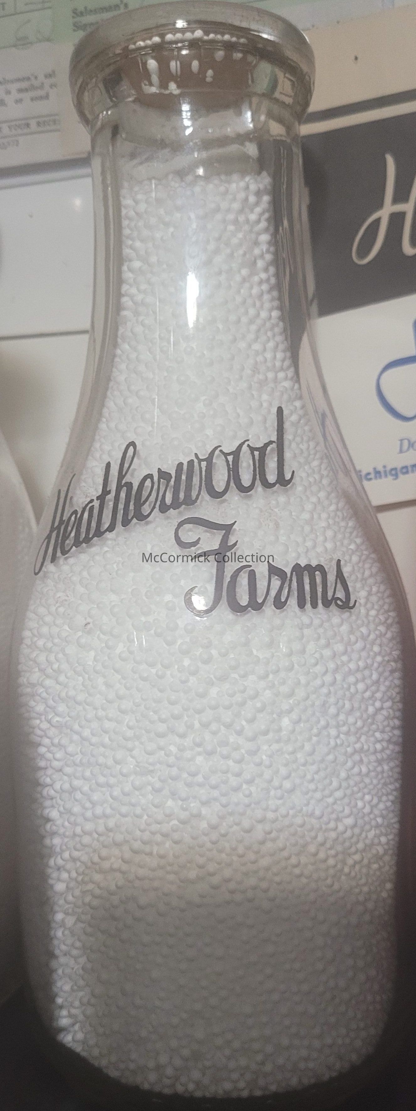 A round tall neck quart with black pyro from the Heatherwood Farms dairy of Lansing, Michigan, with Golden Guernsey seal on the back. Three.