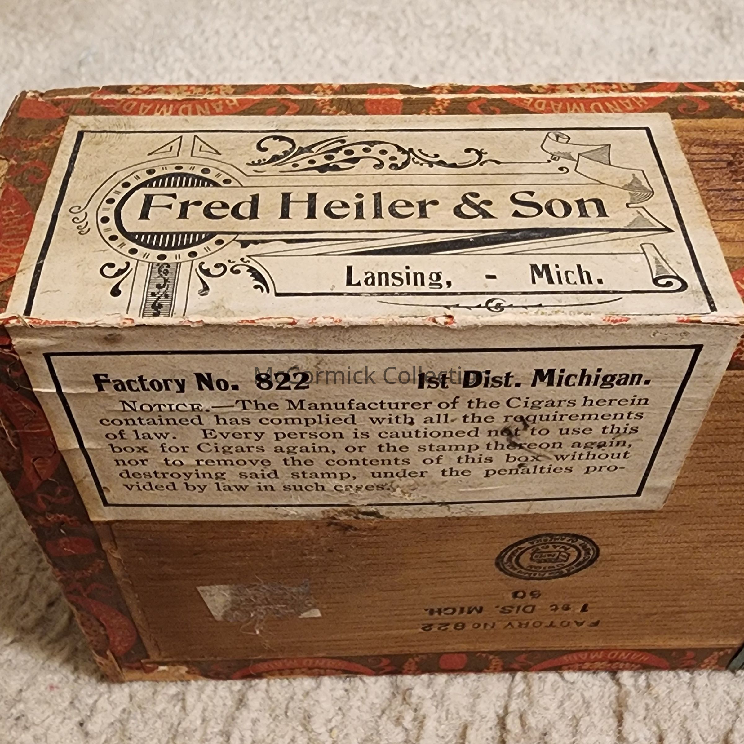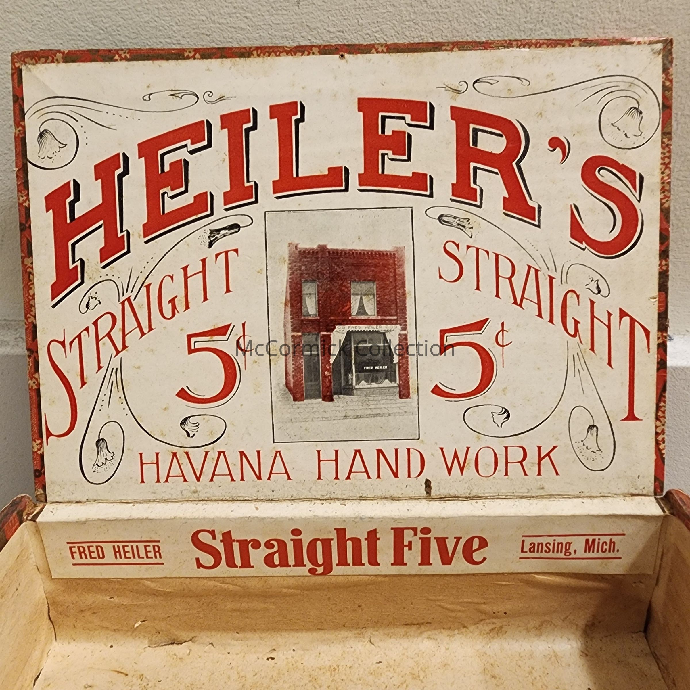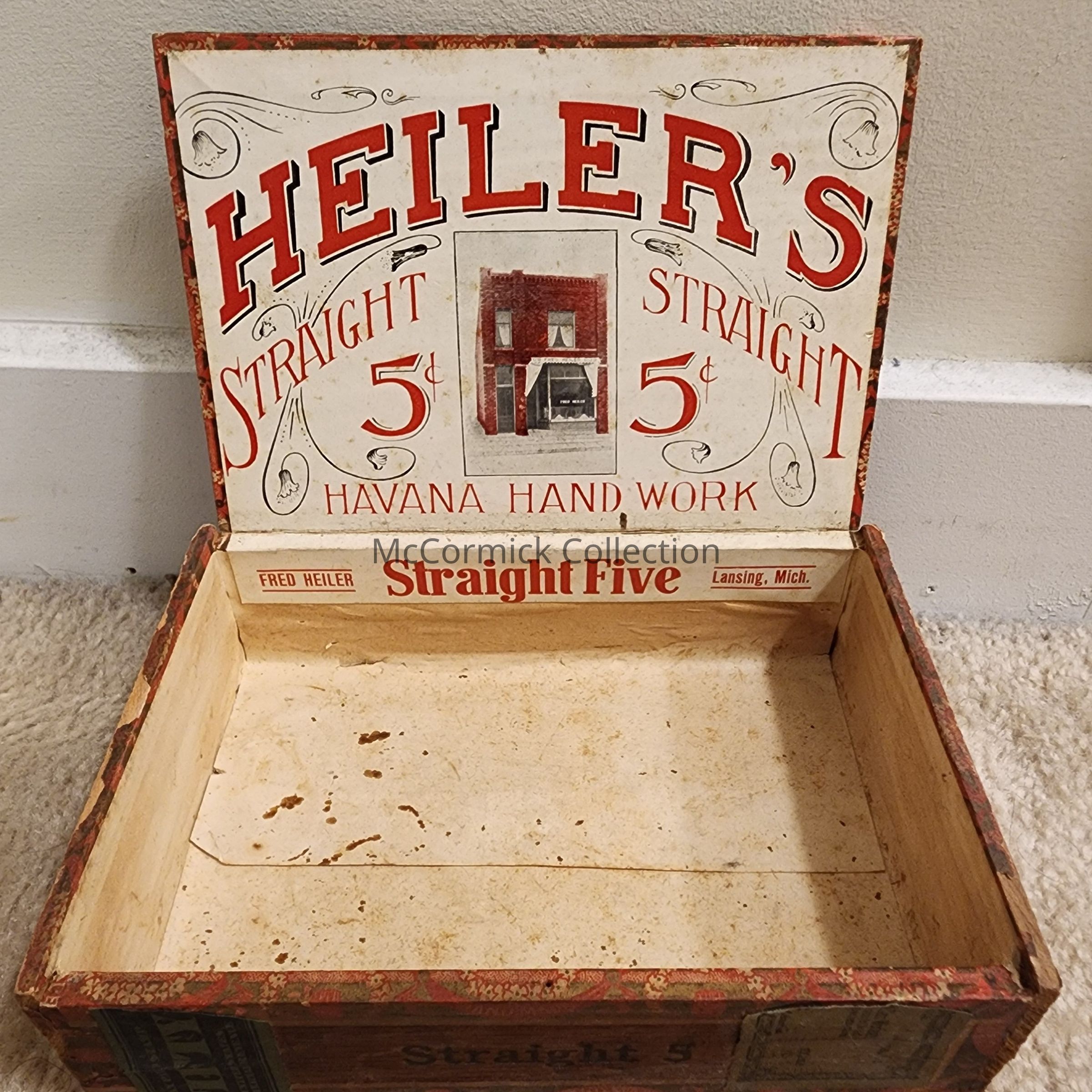 An antique advertising cigar box from Lansing, Michigan, by Heiler's Straight Five.