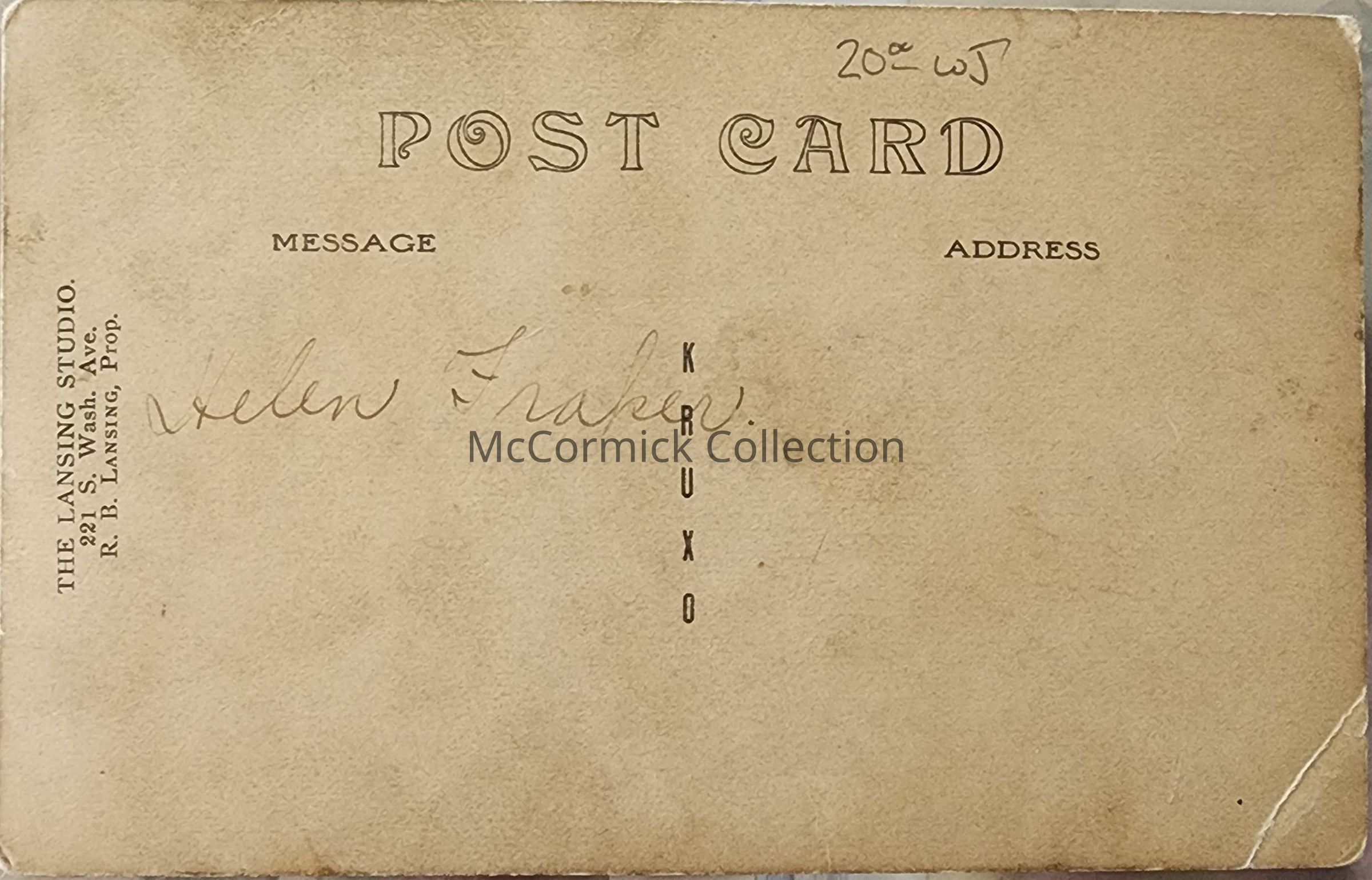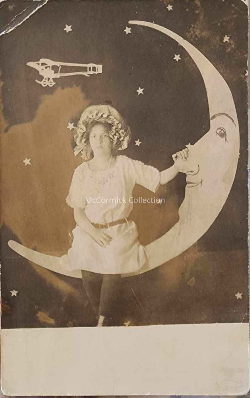 Real photo postcard of Helen Fraker on a paper moon backdrop by Lansing photographer Lansing Studio.