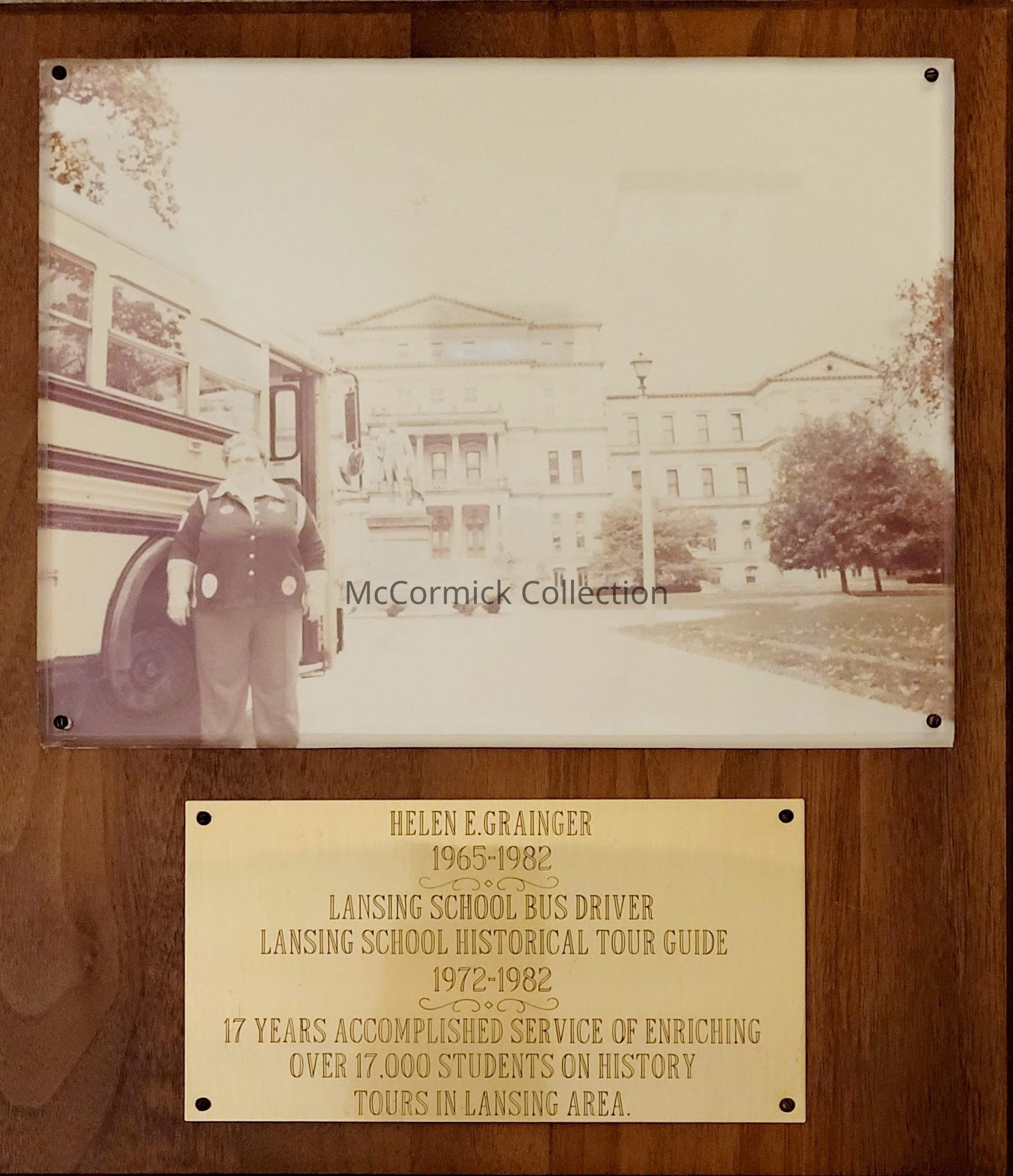 Helen E. Grainger (1927-2007) was a Lansing school bus driver for 17 years, 1965-1982, and gave historical bus tours and field trips for a decade of that time, 1972-1982. Grainger was president of the Historical Society of Greater Lansing in 1977-1978. She was the founding president of the Mason Area Historical Society in 1976, and served in that capacity for many years. Grainger turned her historical bus tour into a book in 1976 with "Pictorial Lansing: Great City on the Grand."