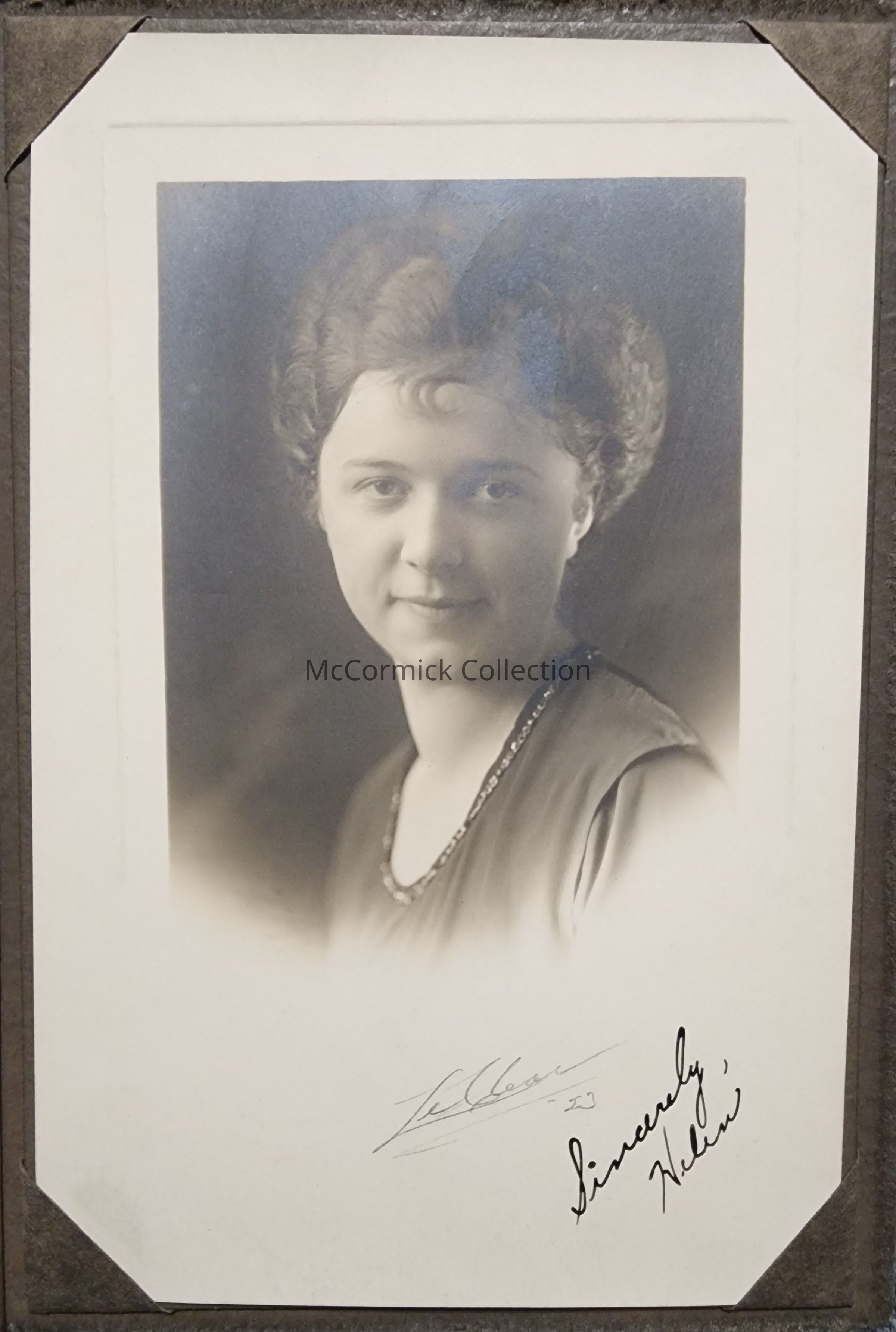 Folder frame mounted photograph of a woman named Helen by Lansing photographer LeClear. Dated 1923.