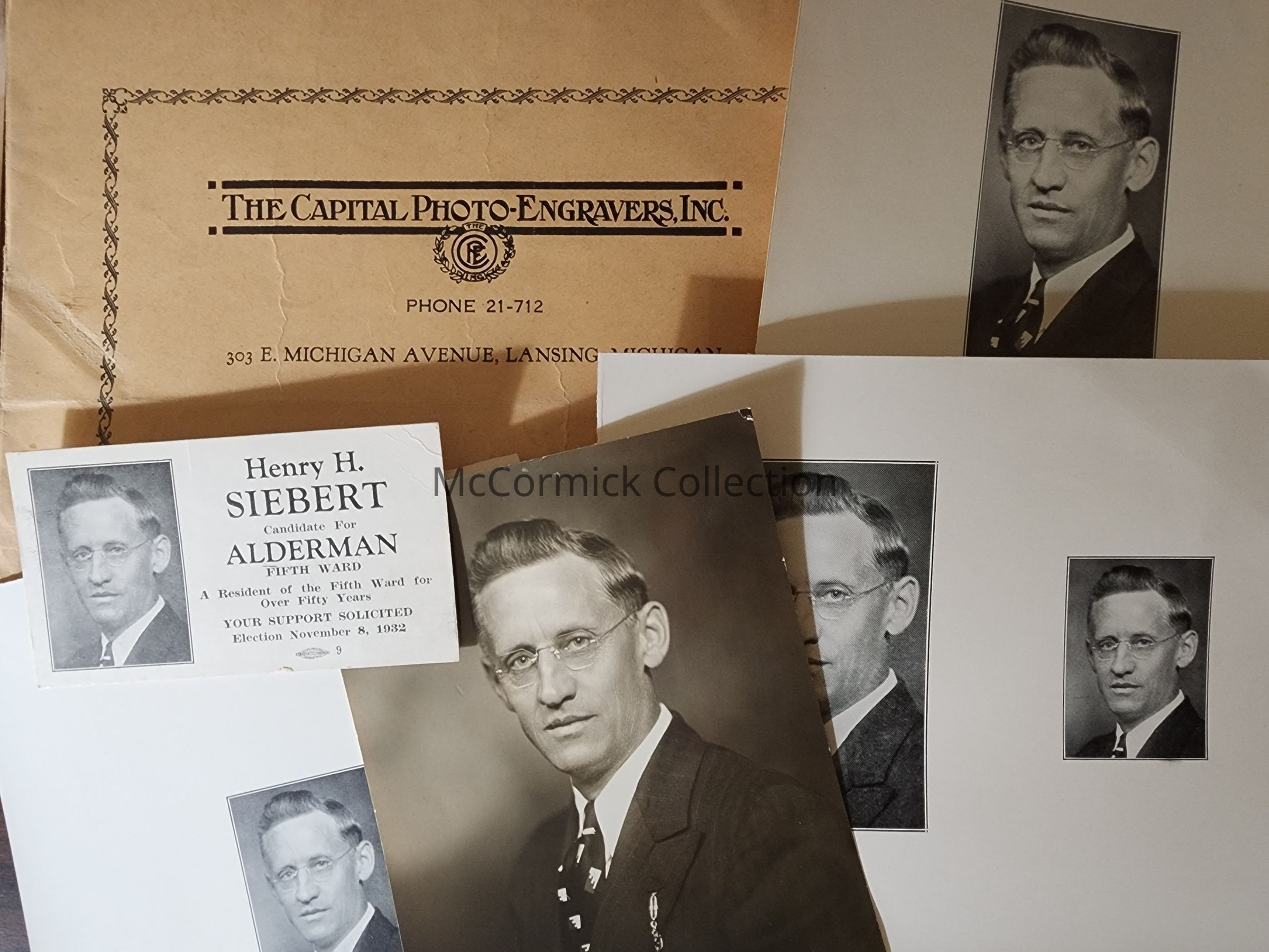 Collection of three sheets of engravings of a portrait of Henry H. Siebert, the original photograph of Siebert, and the political campaign card that the engraving was used on. Also included is the Capital Photo Engravers envelope and a 1933 newspaper clipping relating to Siebert's run for Lansing City Alderman.