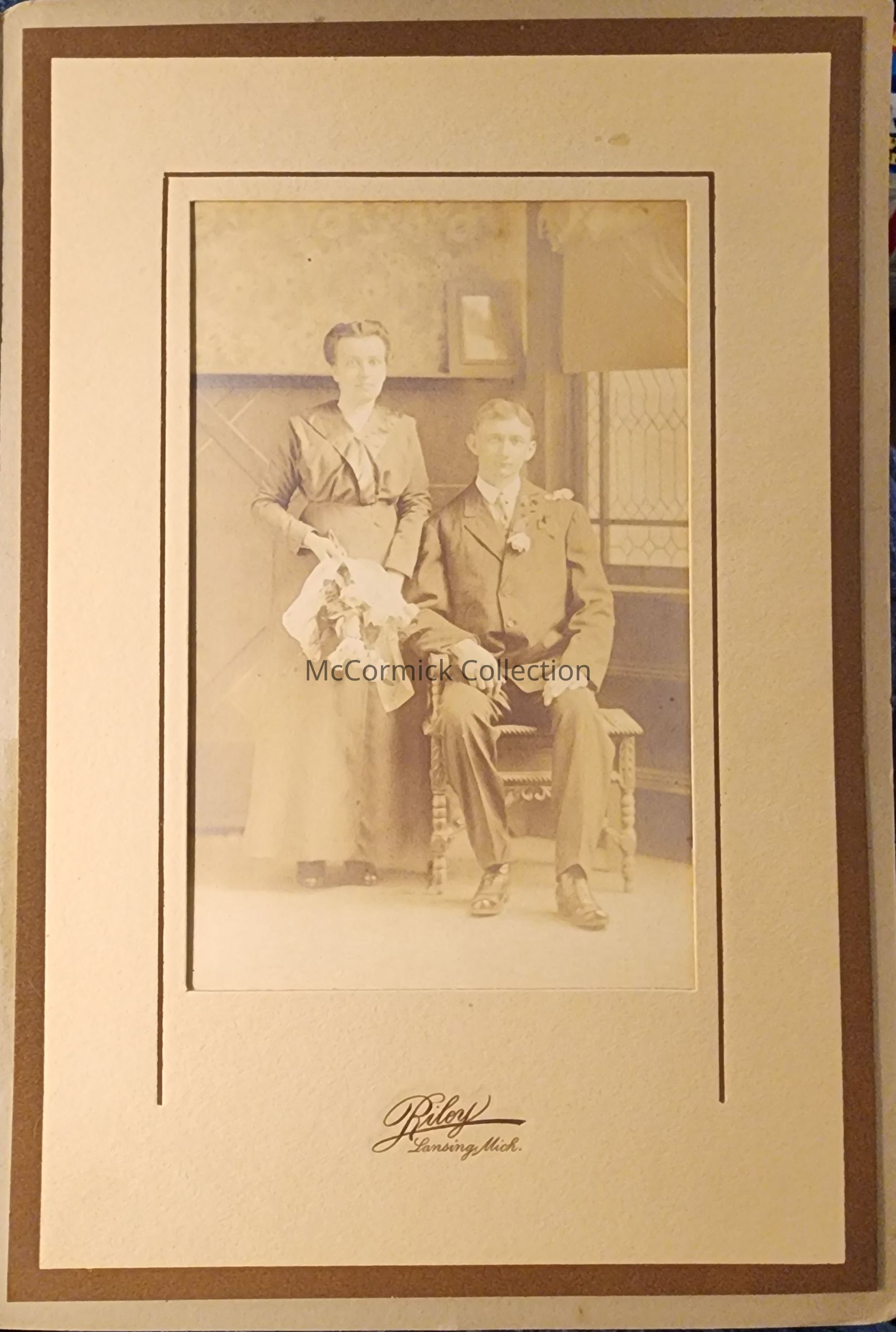 Folder frame mounted photograph of a man and woman identified as Herman and Mary by Lansing photographer Riley. Two copies.
