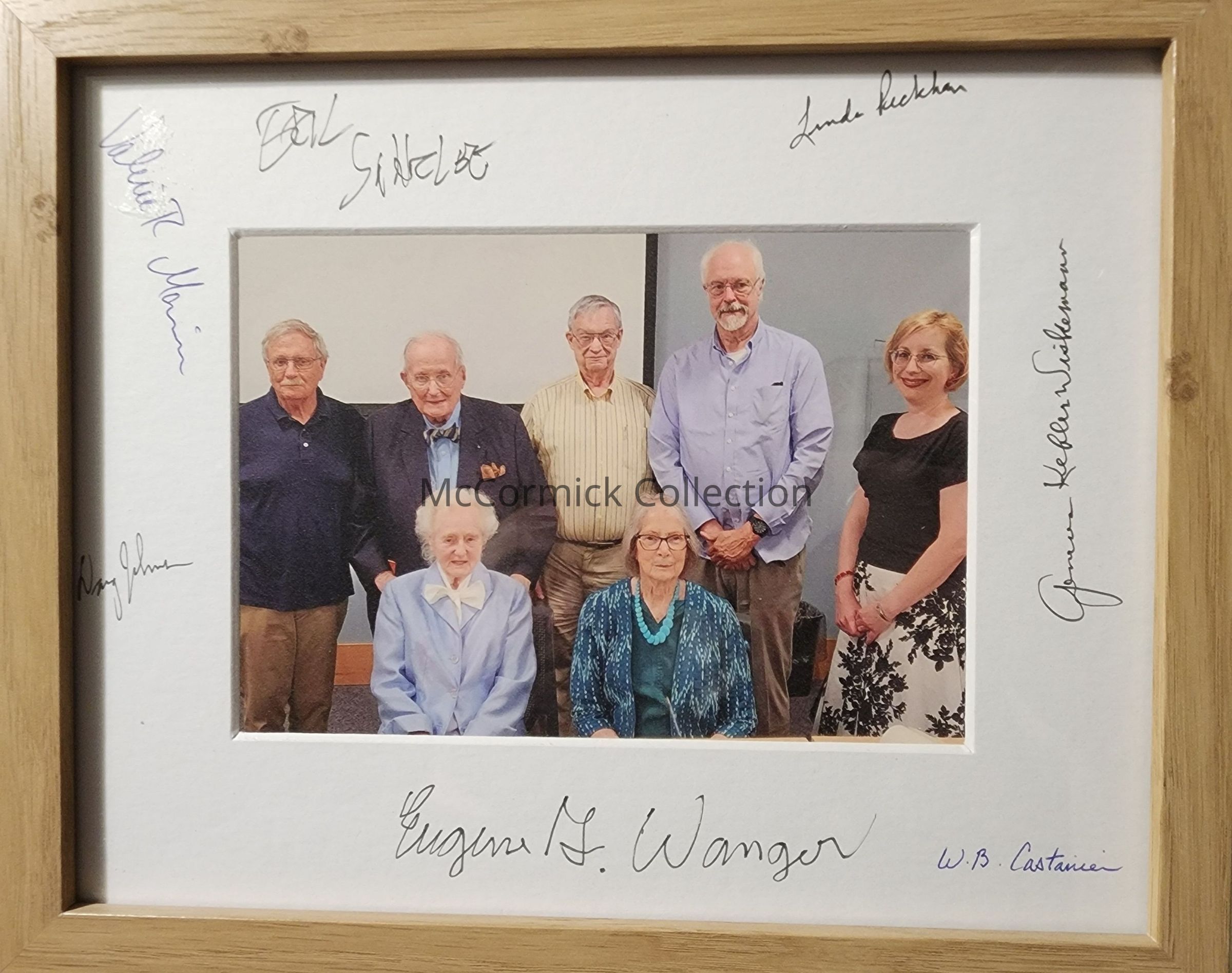Framed photograph of the 2023 gathering of the 75th anniversary of the founding of the Lansing Historical Society (later the HSGL). Pictured are (top, left to right): Bill Castanier, Eugene G. Wanger, Doug Johnson, Eric Satterlee, and Valerie Marvin; (bottom, left to right): Geneva Wiskemann and Linda Peckham.