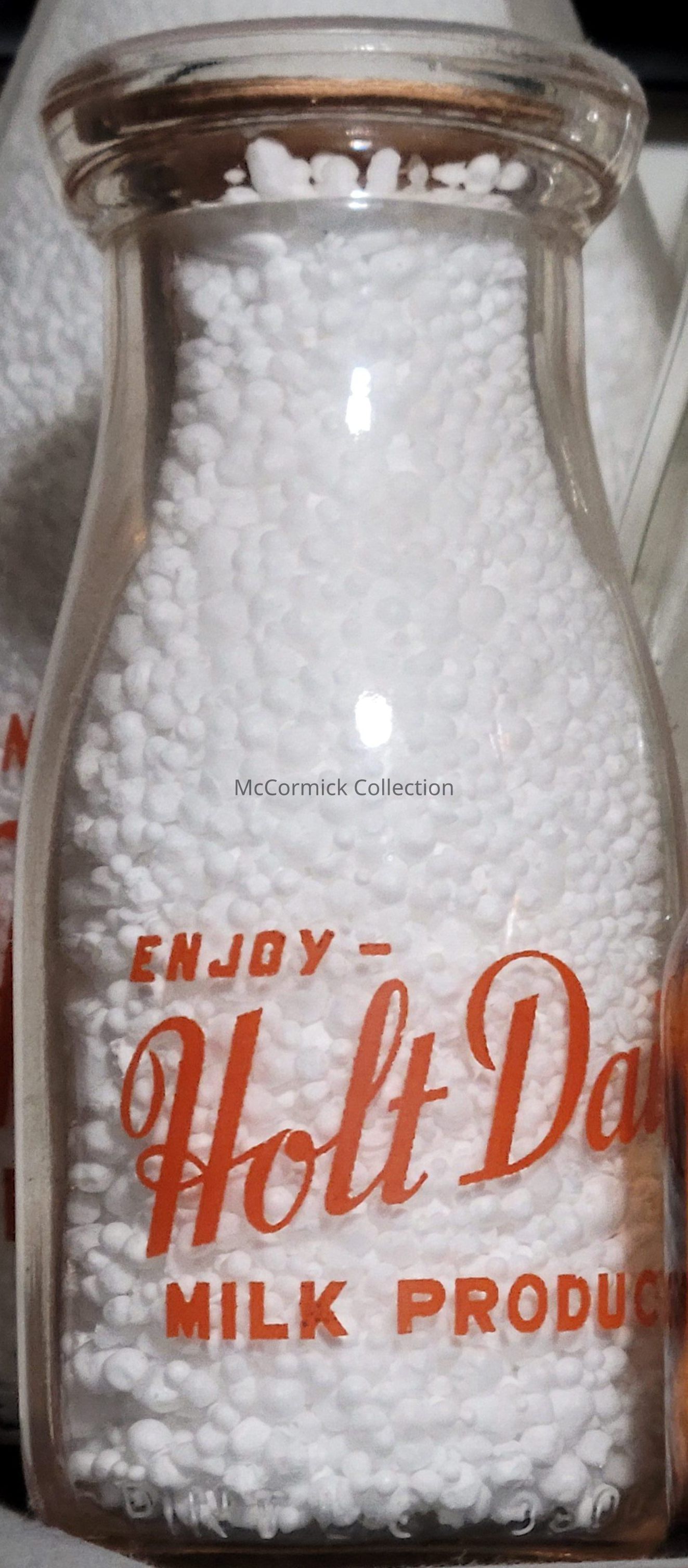A half pint orange pyro bottle from the Holt Dairy Company with "Enjoy" slogan.