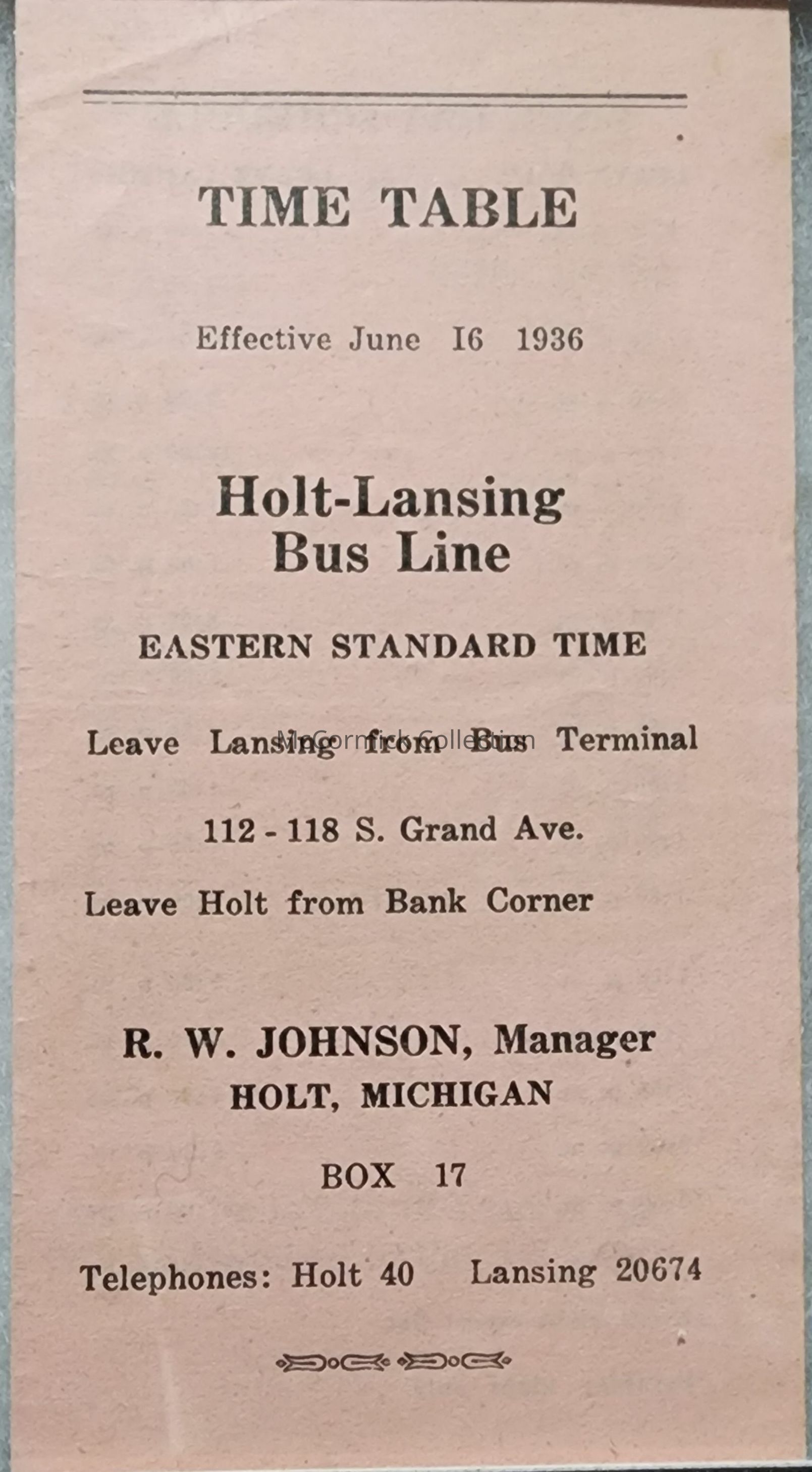 Pink paper time table from the Holt-Lansing Bus Line. From the estate of Great Aunt Sharon Reed Dodge.