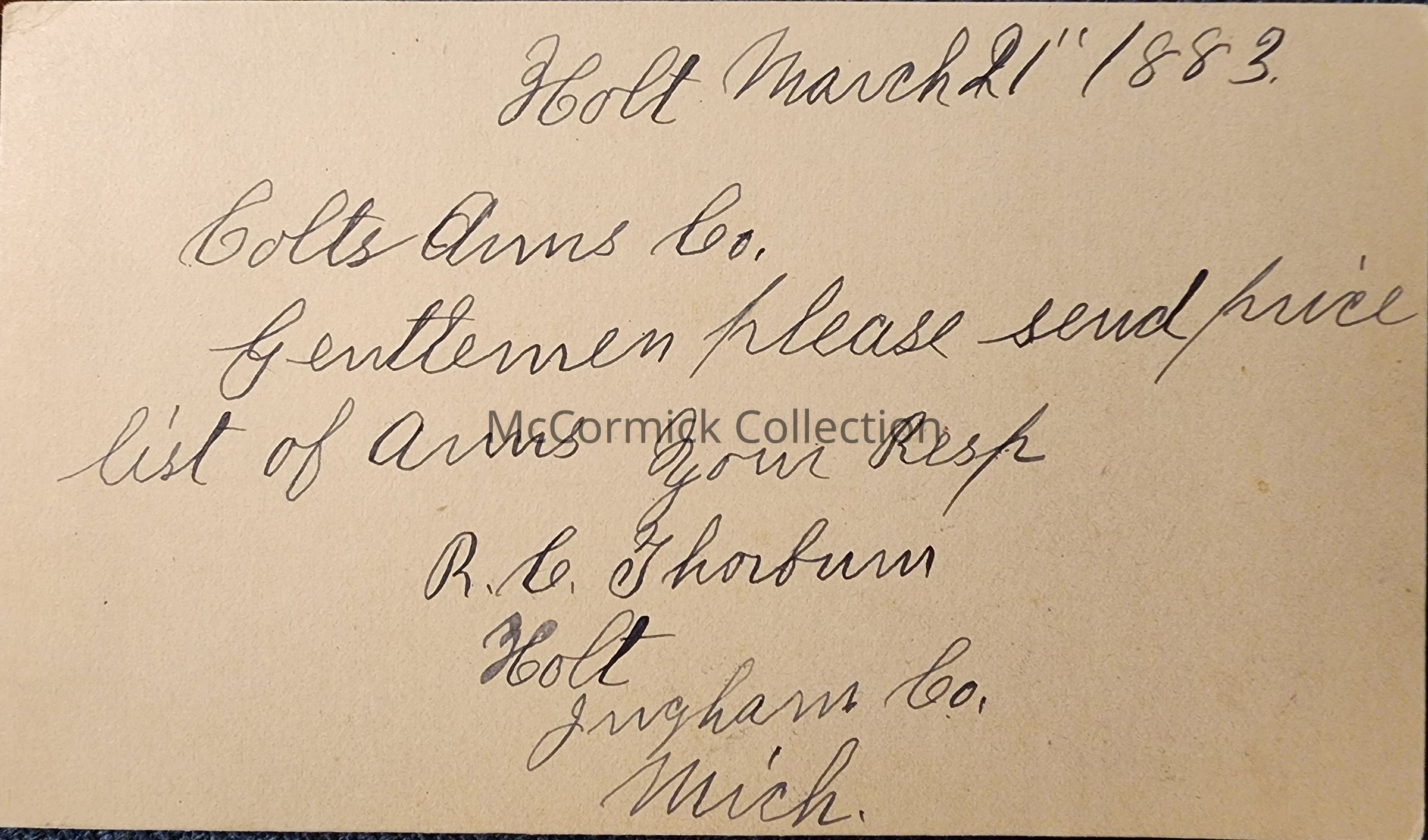 Addressed to Colts Arms Co., from R.C. Thorburn, Holt, Michigan, 1883.