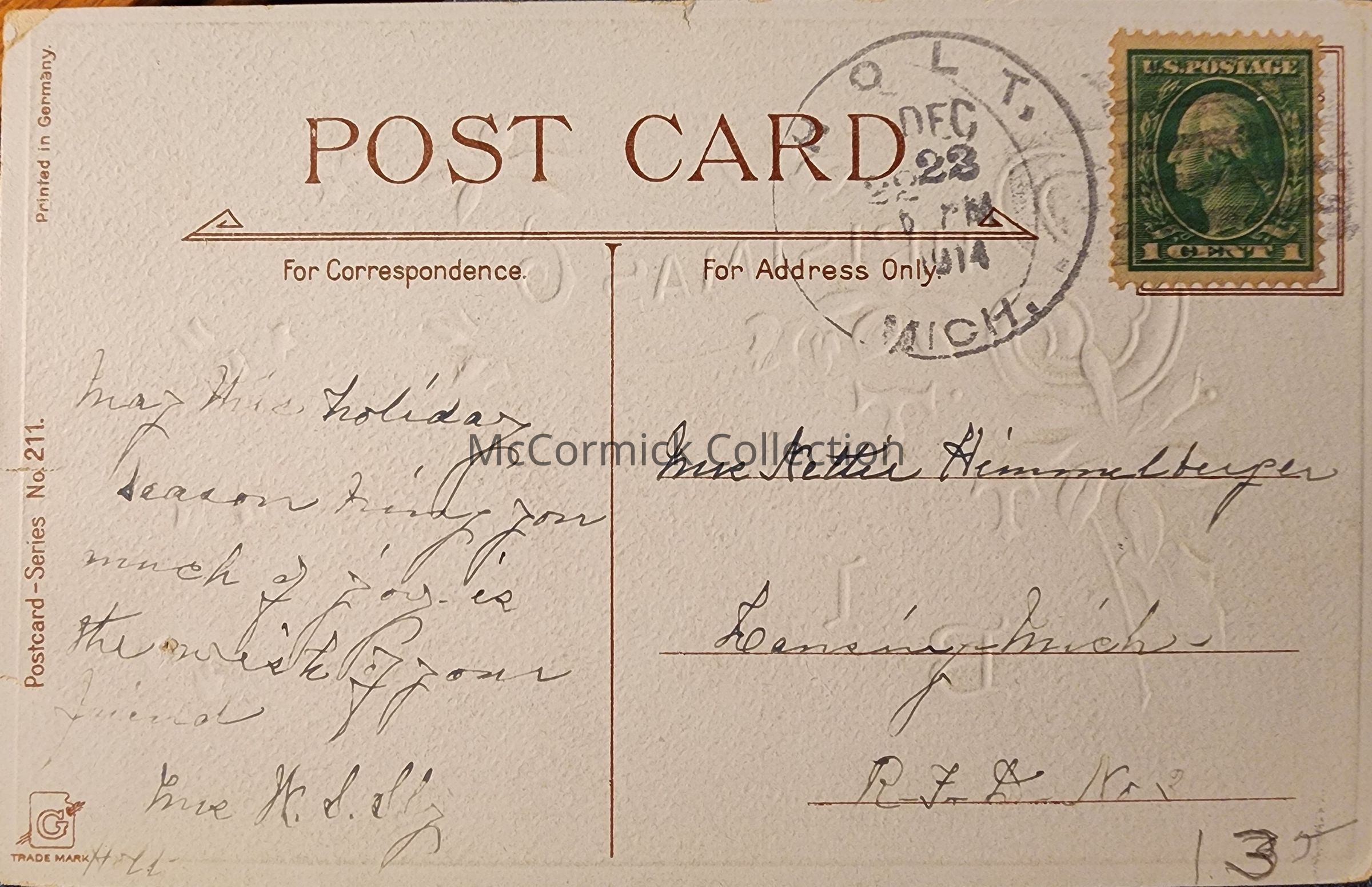 Addressed to Nettie Himmelberger, Lansing, Mich.