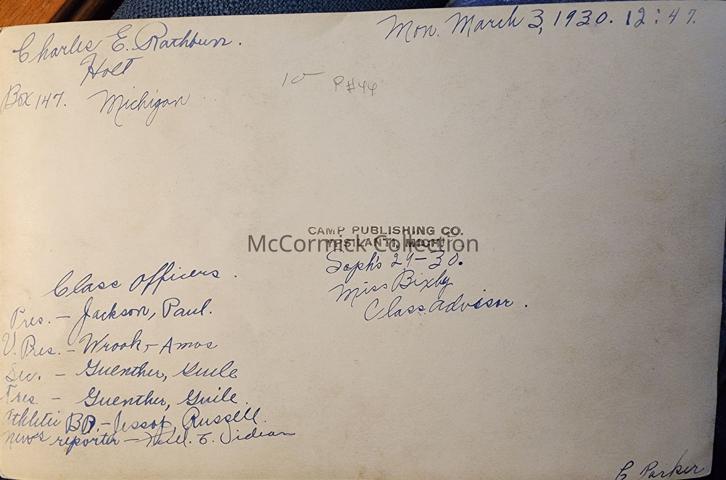 Holt High School sophomore class, 1929-1930. Mrs. Bixby, class advisor. Dated Monday, March 3, 1930, 12:47. Class officers listed: Paul Jackson, president; Amos Wrook, vice president; Guile Guenther, secretary and treasurer; athletic board: Russell Jessop; news reporter: illegible. The name Charles E. Rathbun, Box 147, Holt, Michigan, is written on the back with the other identifying information. The name C. Parker is written on the back. Stamped on the back is "Camp Publishing Co., Ypsilanti, Mich."