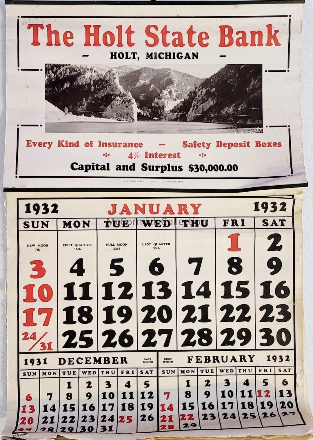 Holt State Bank advertising calendar from 1932.