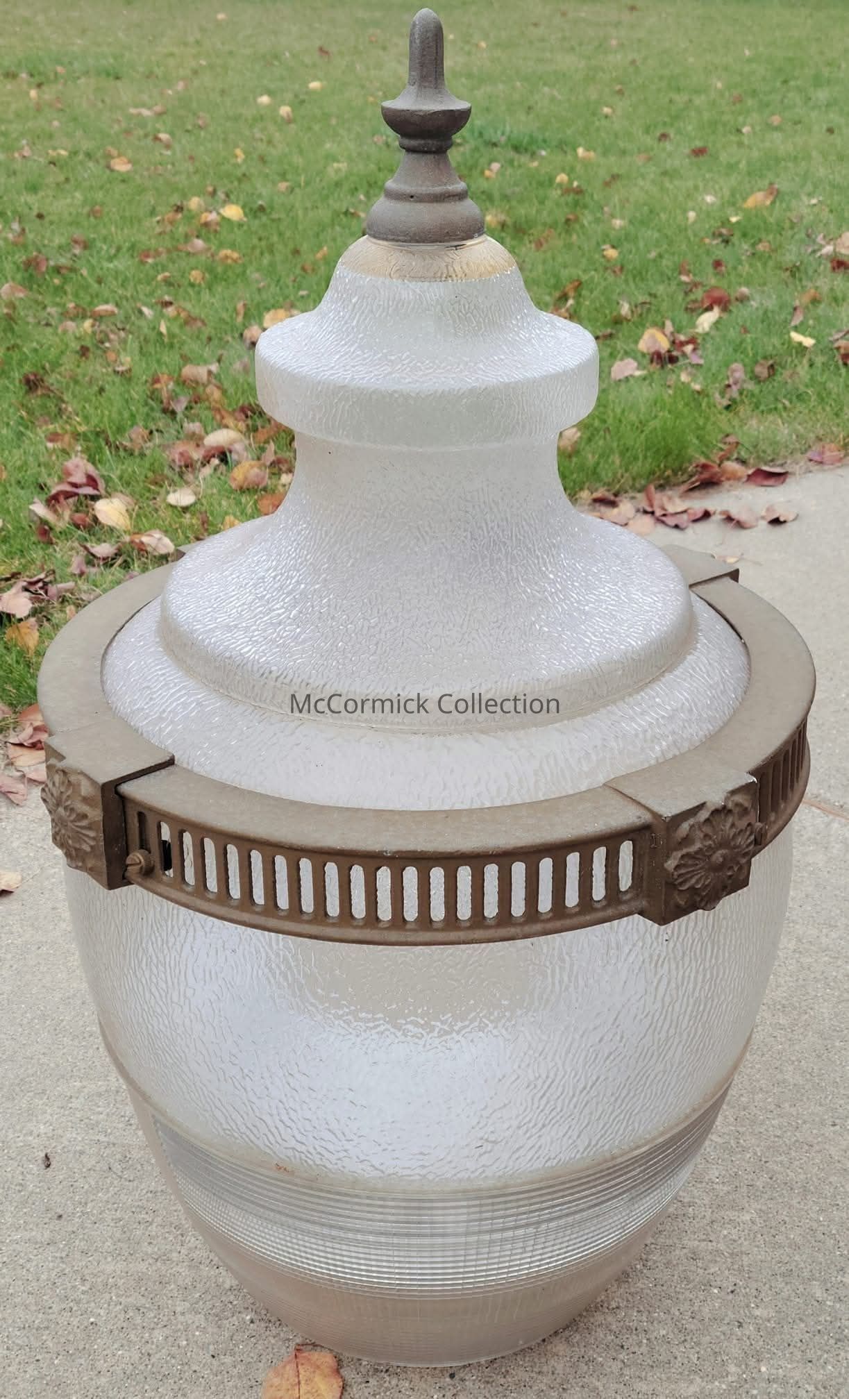 A retired streetlight globe from downtown Holt / Delhi Township. Large and made of plastic. Acquired from a former township employee who salvaged it after its post was struck by a car and damaged.