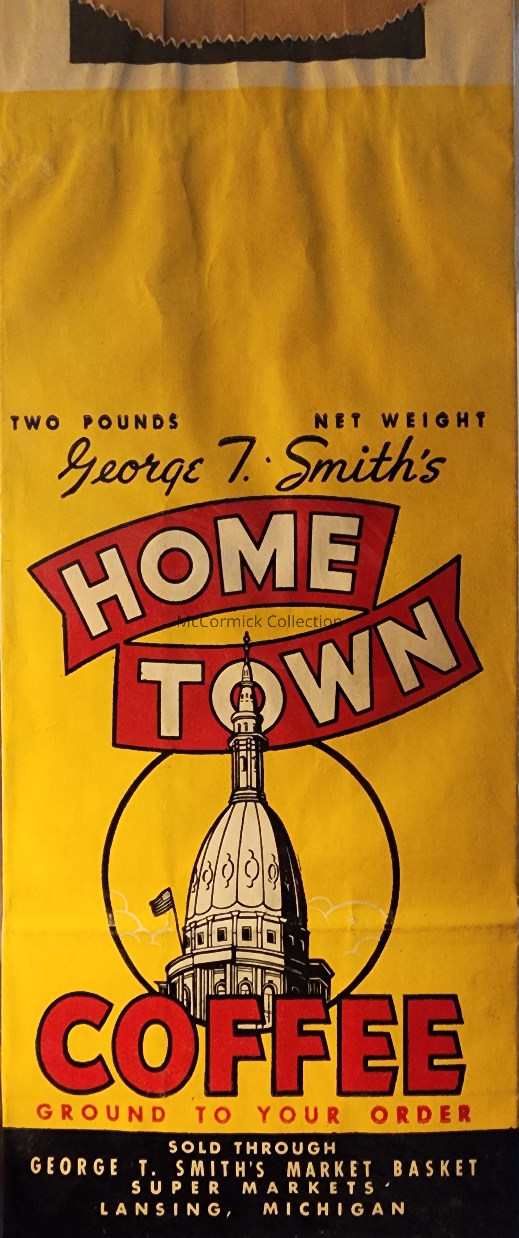 George T. Smith's Home Town Coffee. Sold through George T. Smith's Market Baskets, Lansing, Michigan. Two pound bag. Capitol dome as advertising.