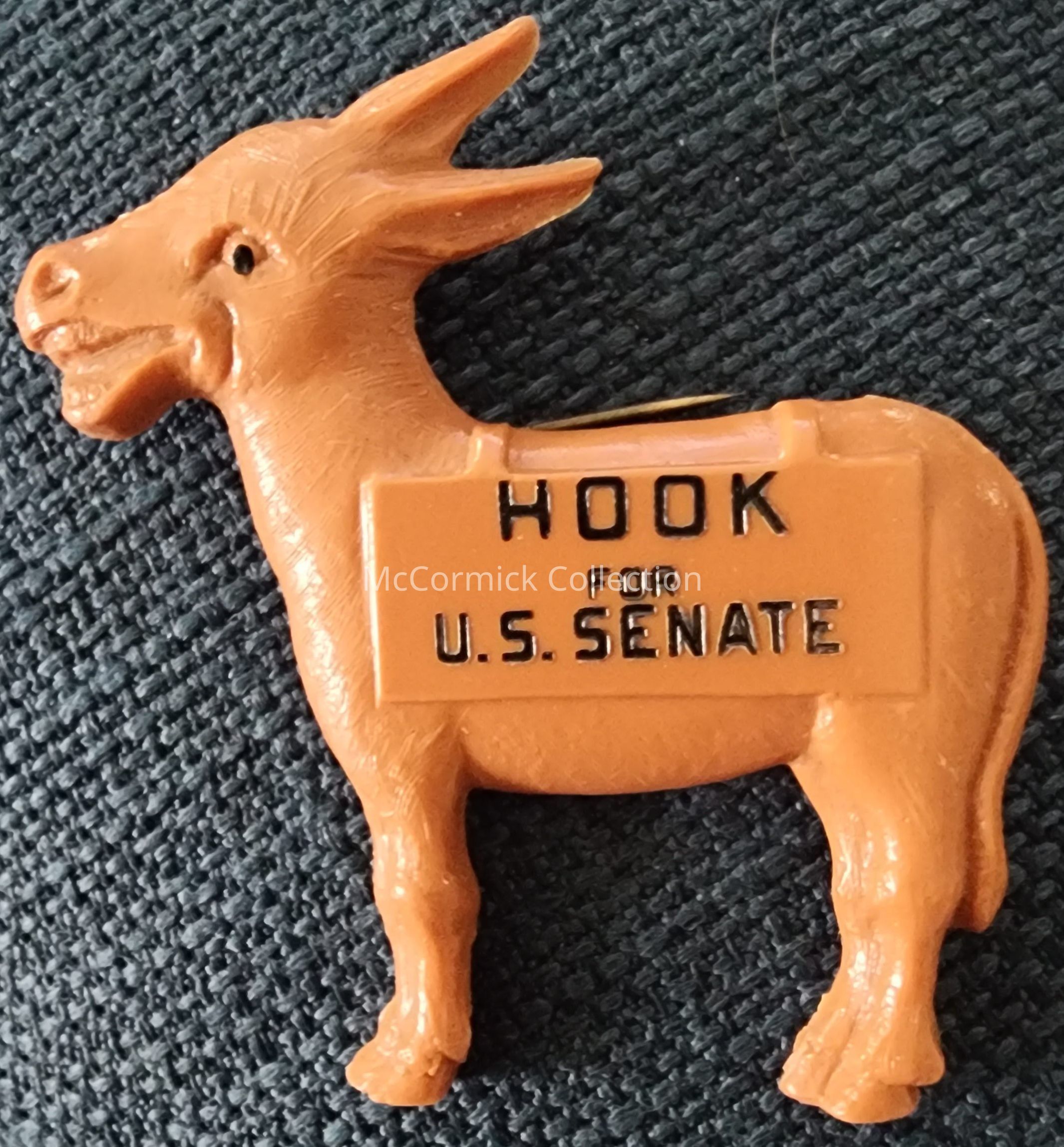 Political pin in the shape of a donkey and made of plastic. The brown donkey pin has black text which reads "Hook for U.S. Senate." Circa 1940s.