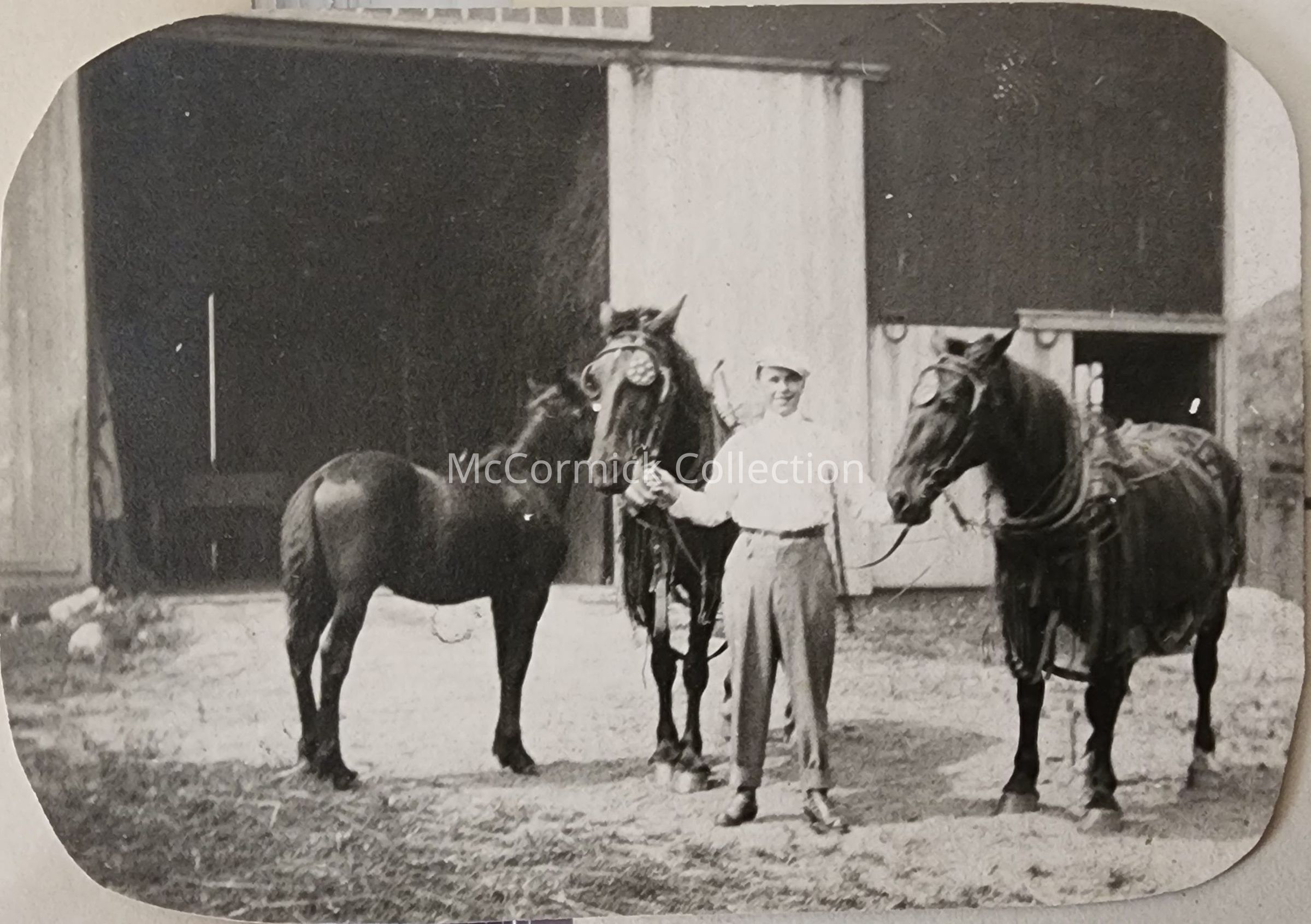 Trimmed real photo postcard of a Man with horses near a barn, likely by Lansing photographer Bovee.
