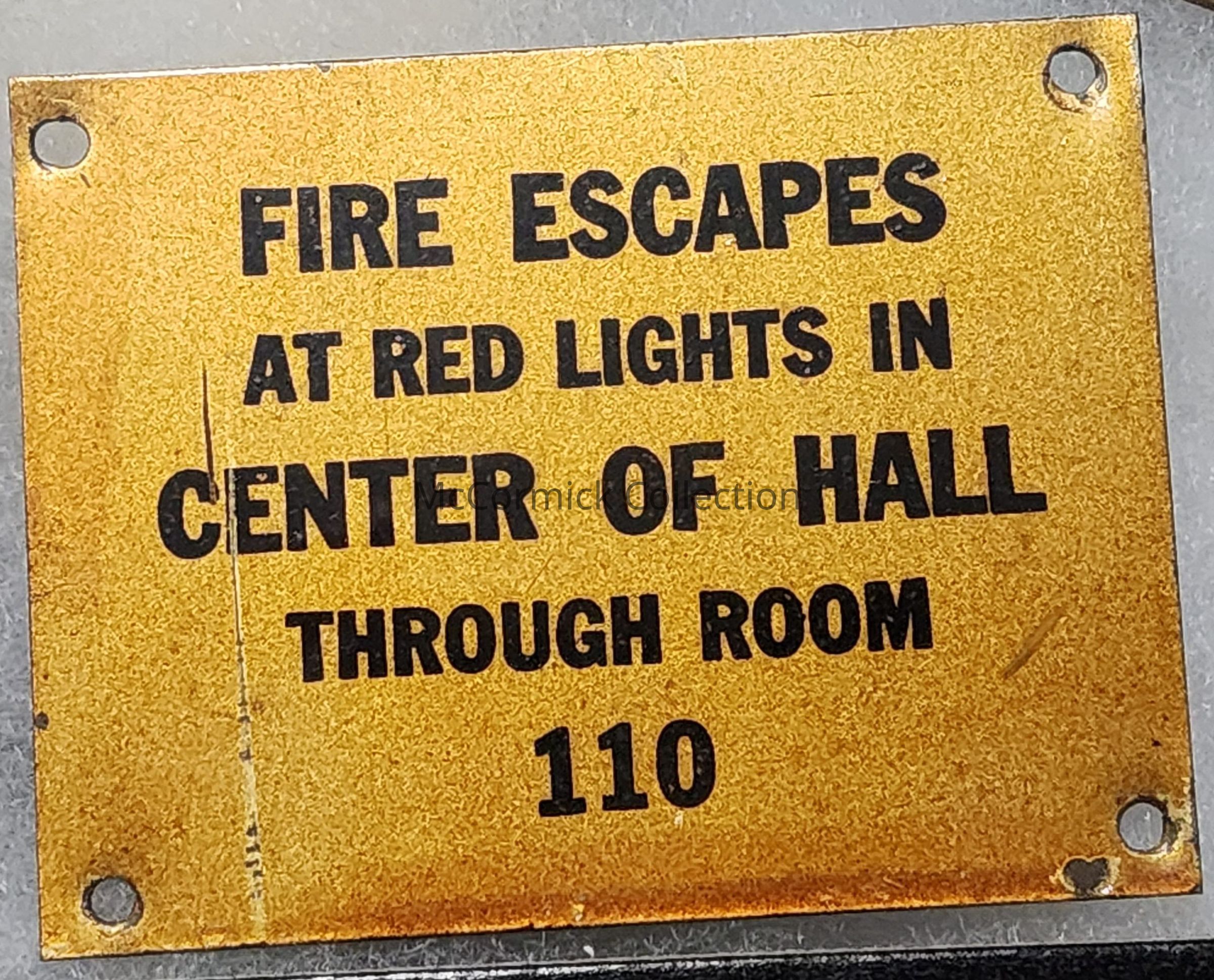 A gold and black brass plaque from the Hotel Detroit in Lansing, it reads: "Fire Escapes at Red Lights in Center of Hall Through Room 110." From the Sophia Tessaris Estate.