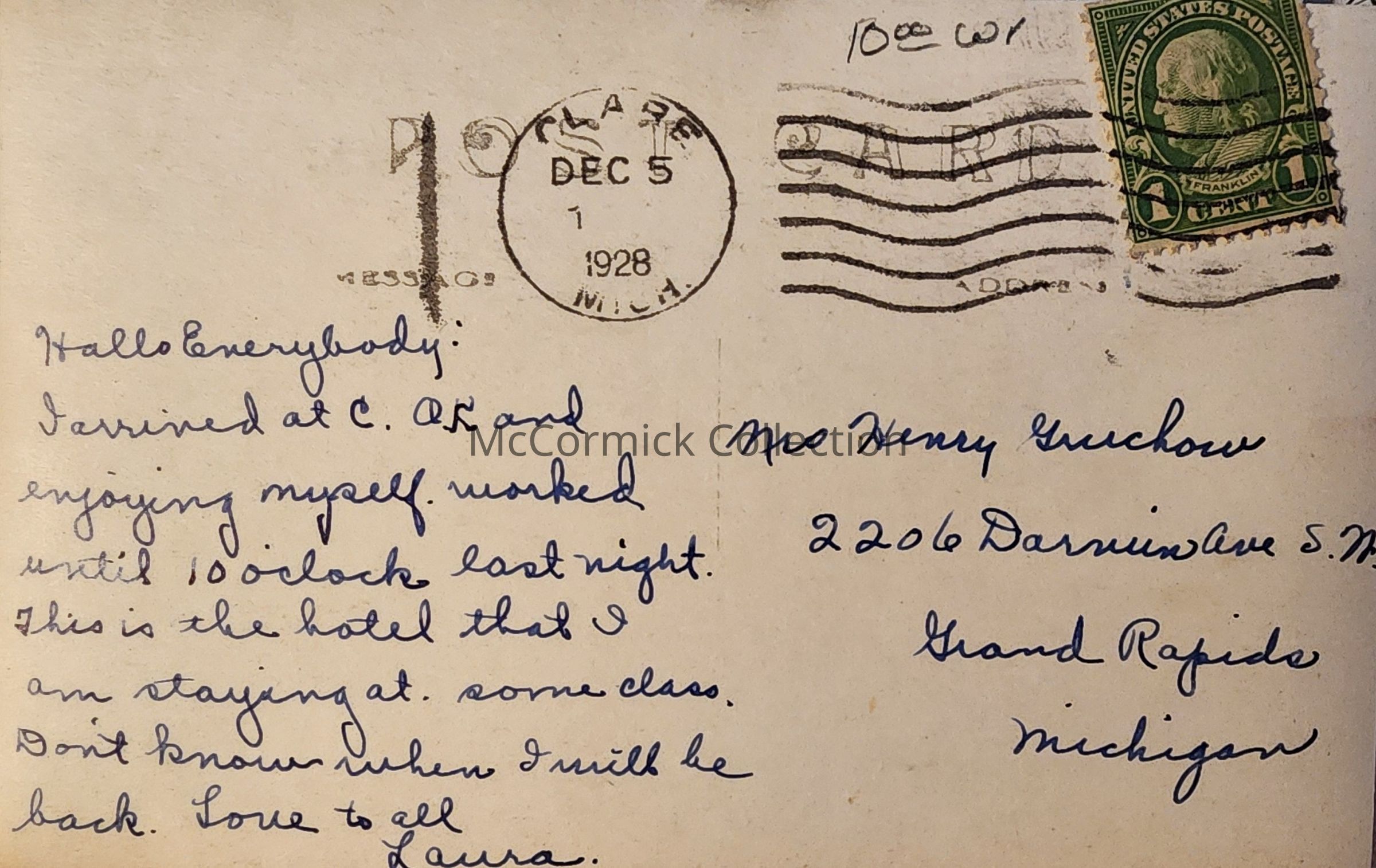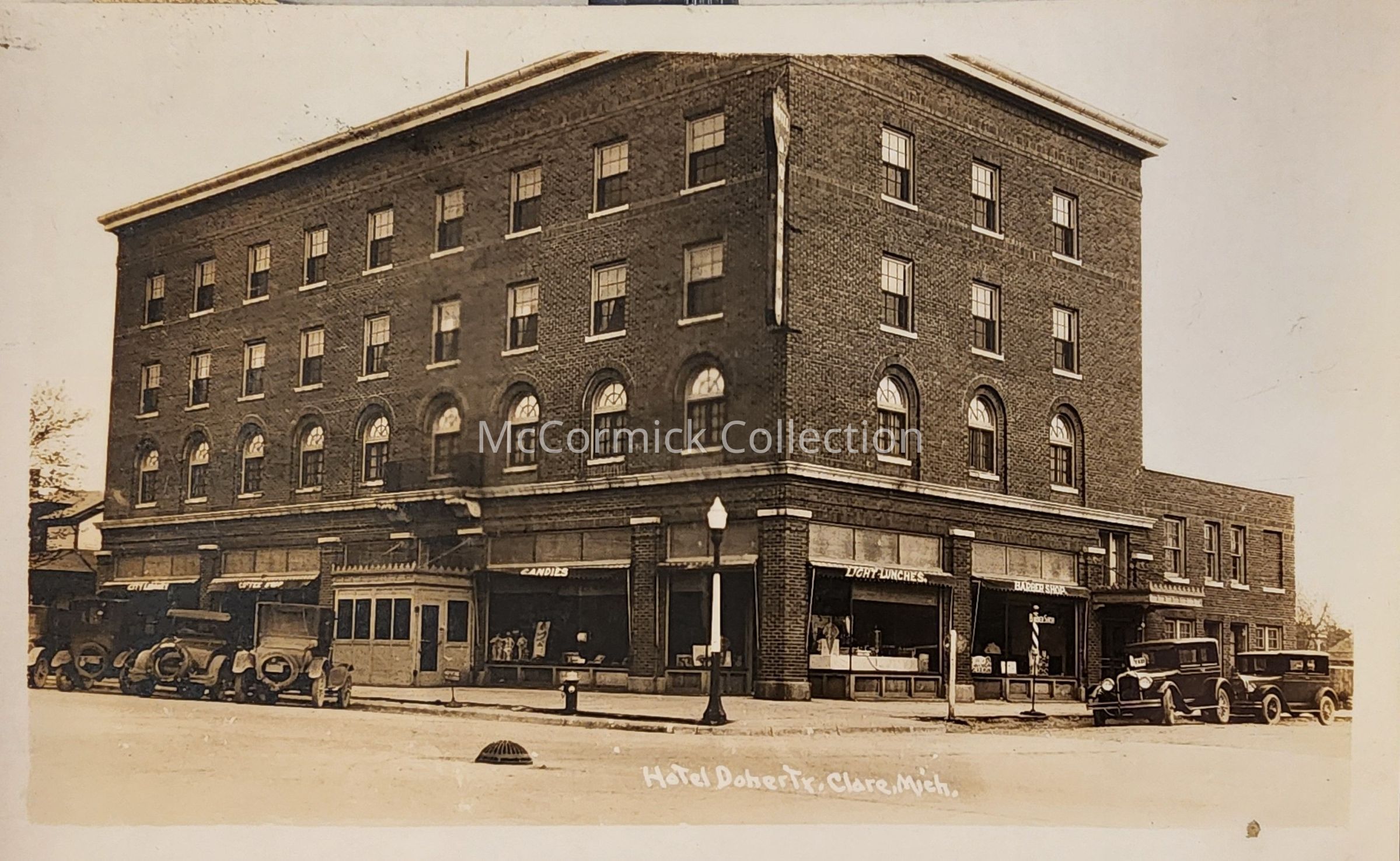 Real photo postcard of the Hotel Doherty in Clare, Michigan, 1928.