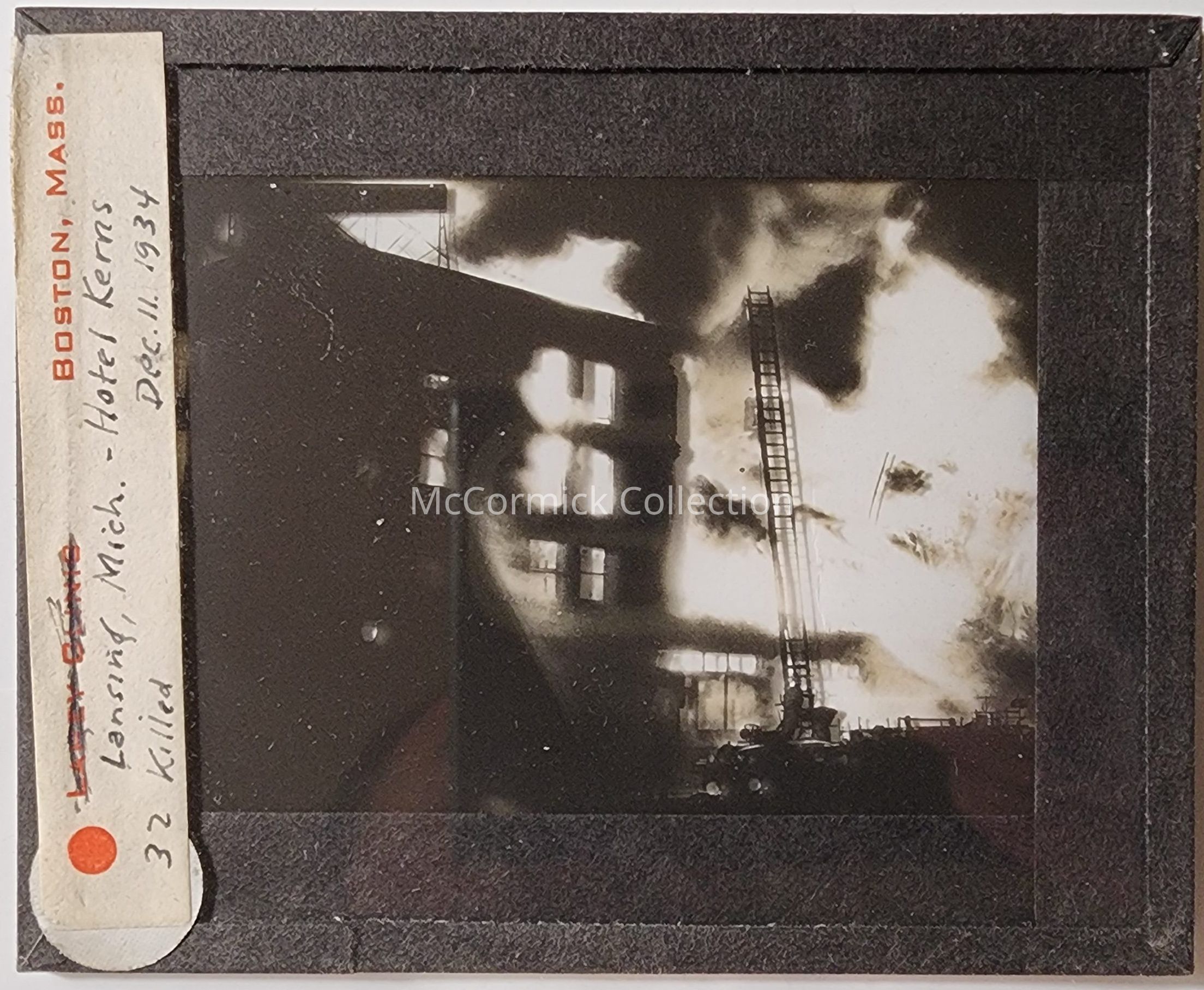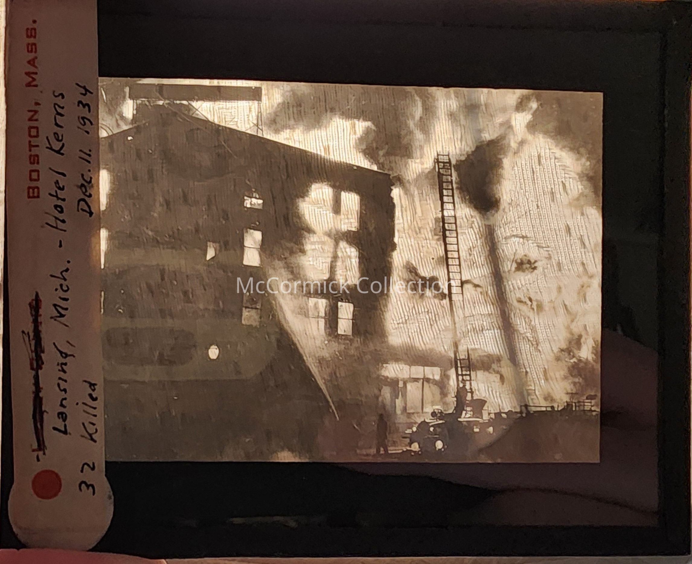 Glass slide of the December 11, 1934, Hotel Kerns fire on Lansing, Michigan. Slide labeled Boston, Mass.