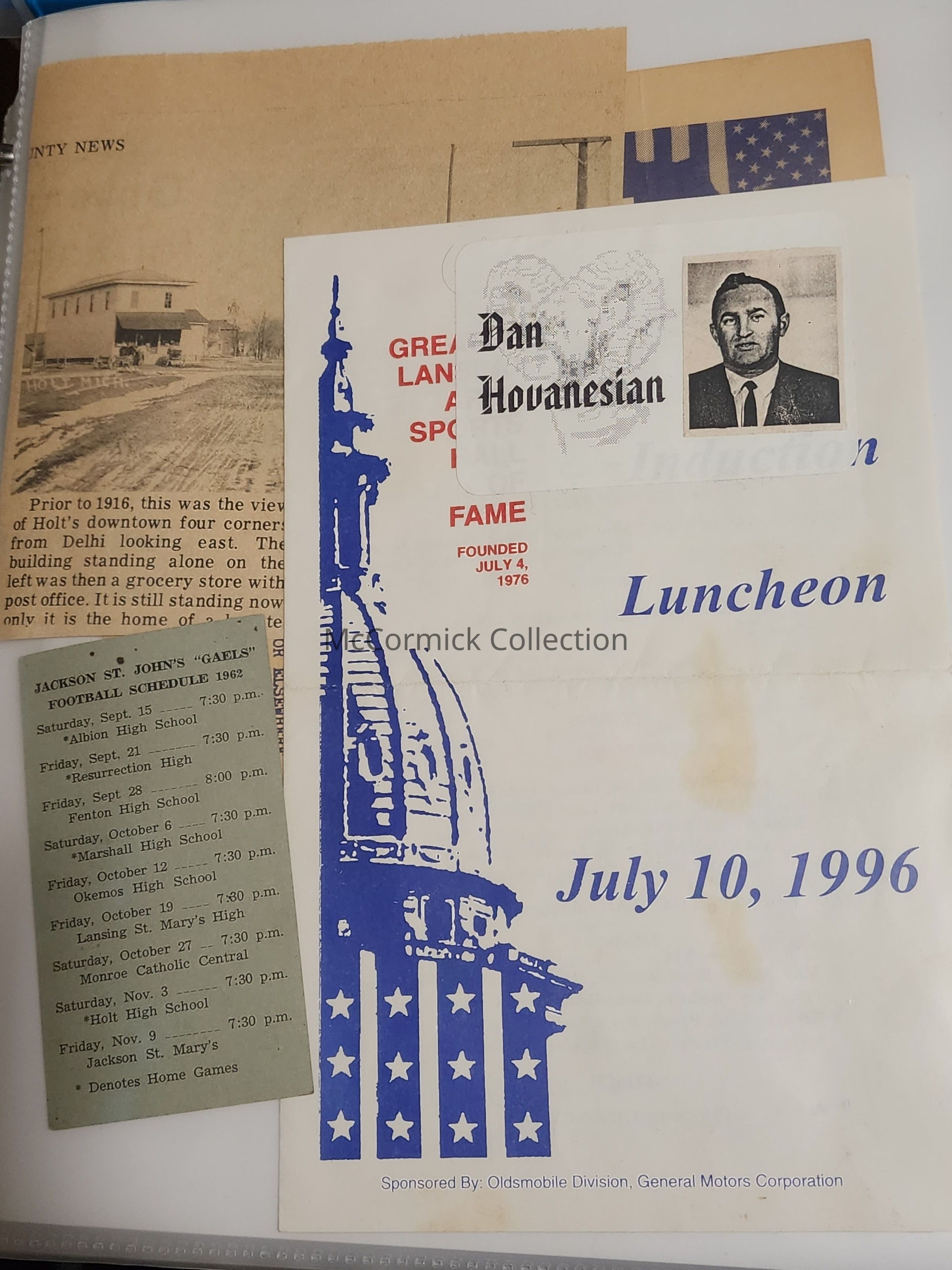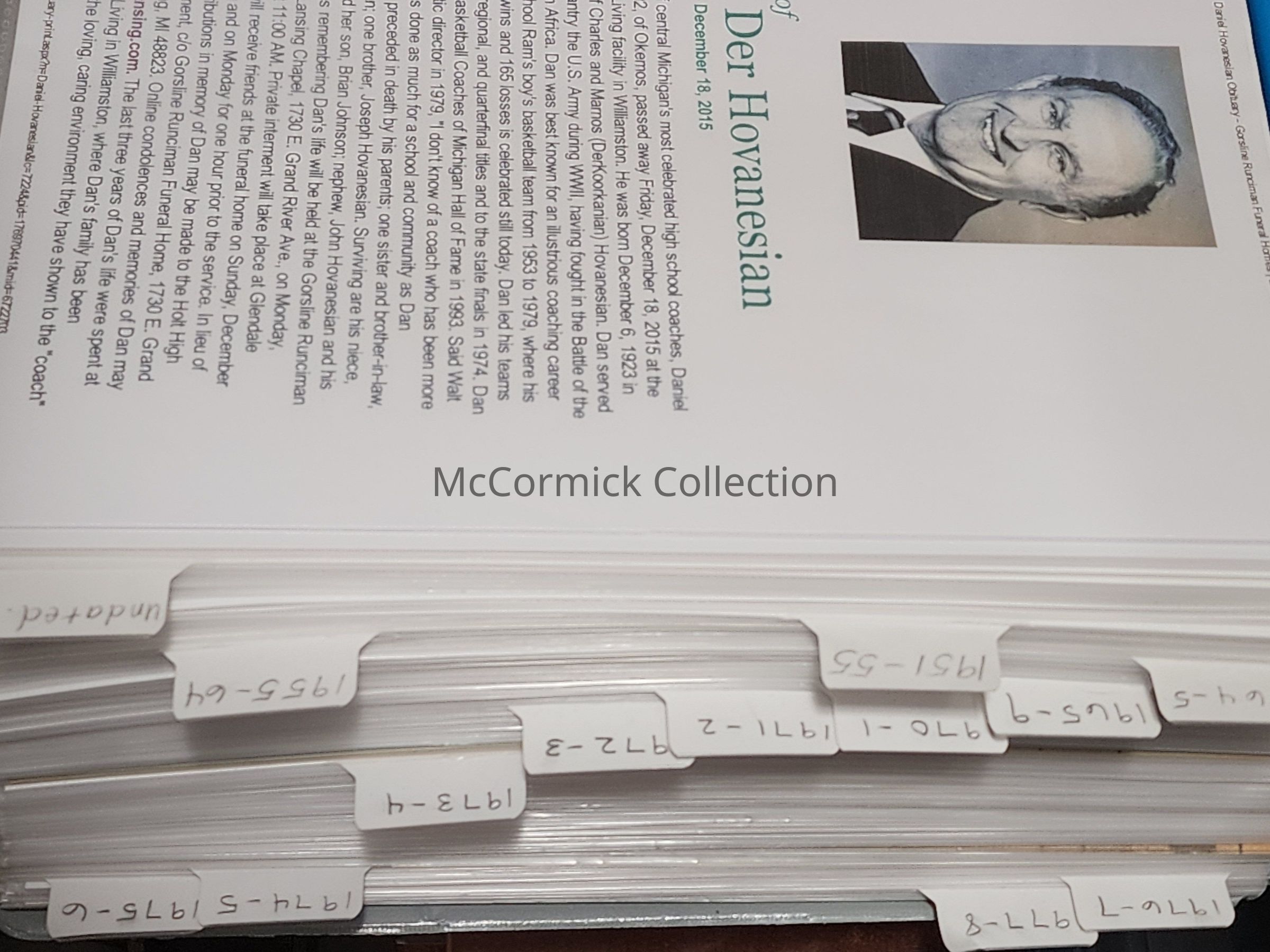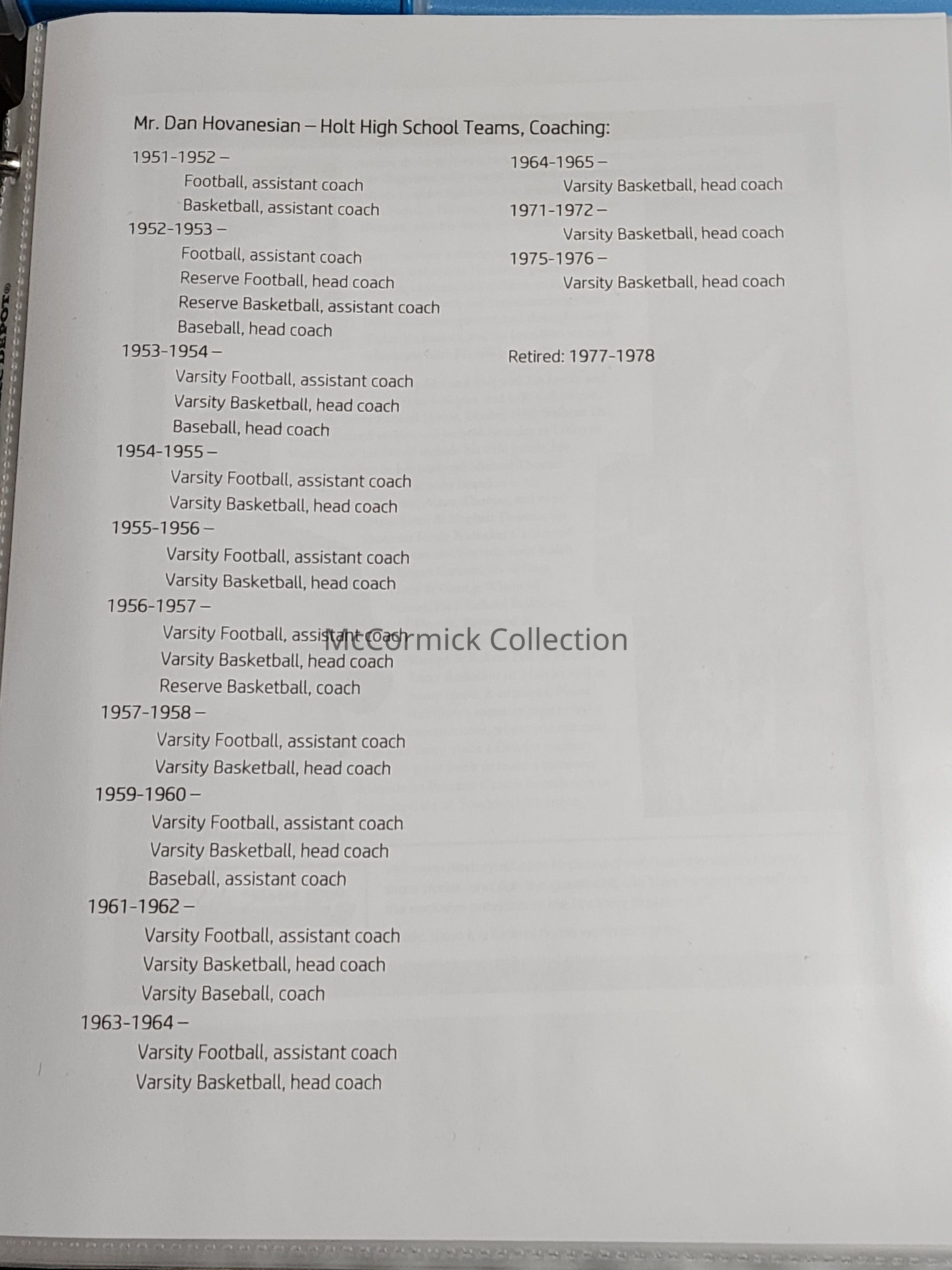 A collection of photographs, clippings, programs, and assorted other memorabilia from the career of Holt High School varsity basketball coach Dan Hovanesian (1923-2015). Hovanesian's career in Holt spanned 1952 through 1978. His Rams were the runners-up to the 1974 state championship.