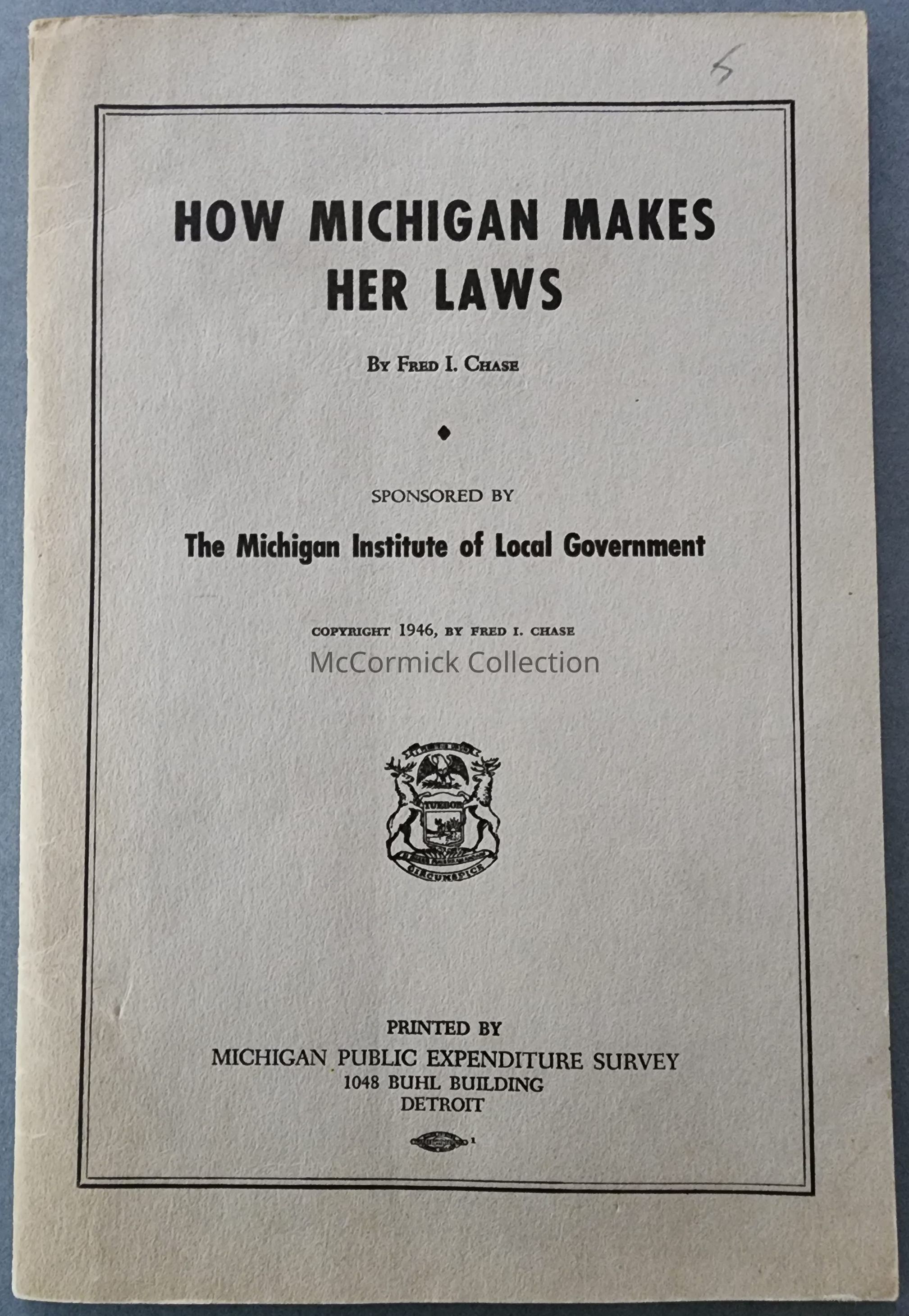 Booklet by Fred I. Chase, circa 1950s, titled How Michigan Makes Her Laws.
