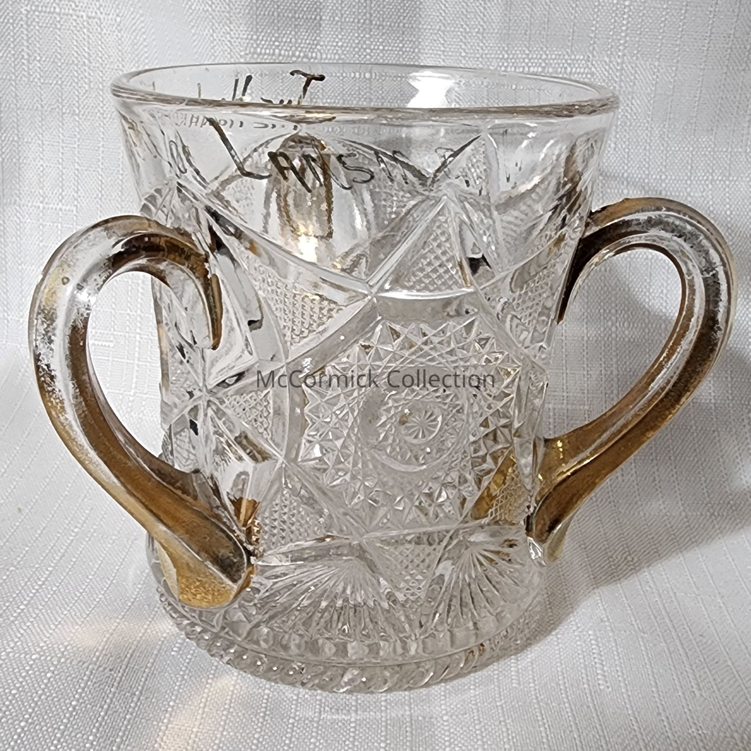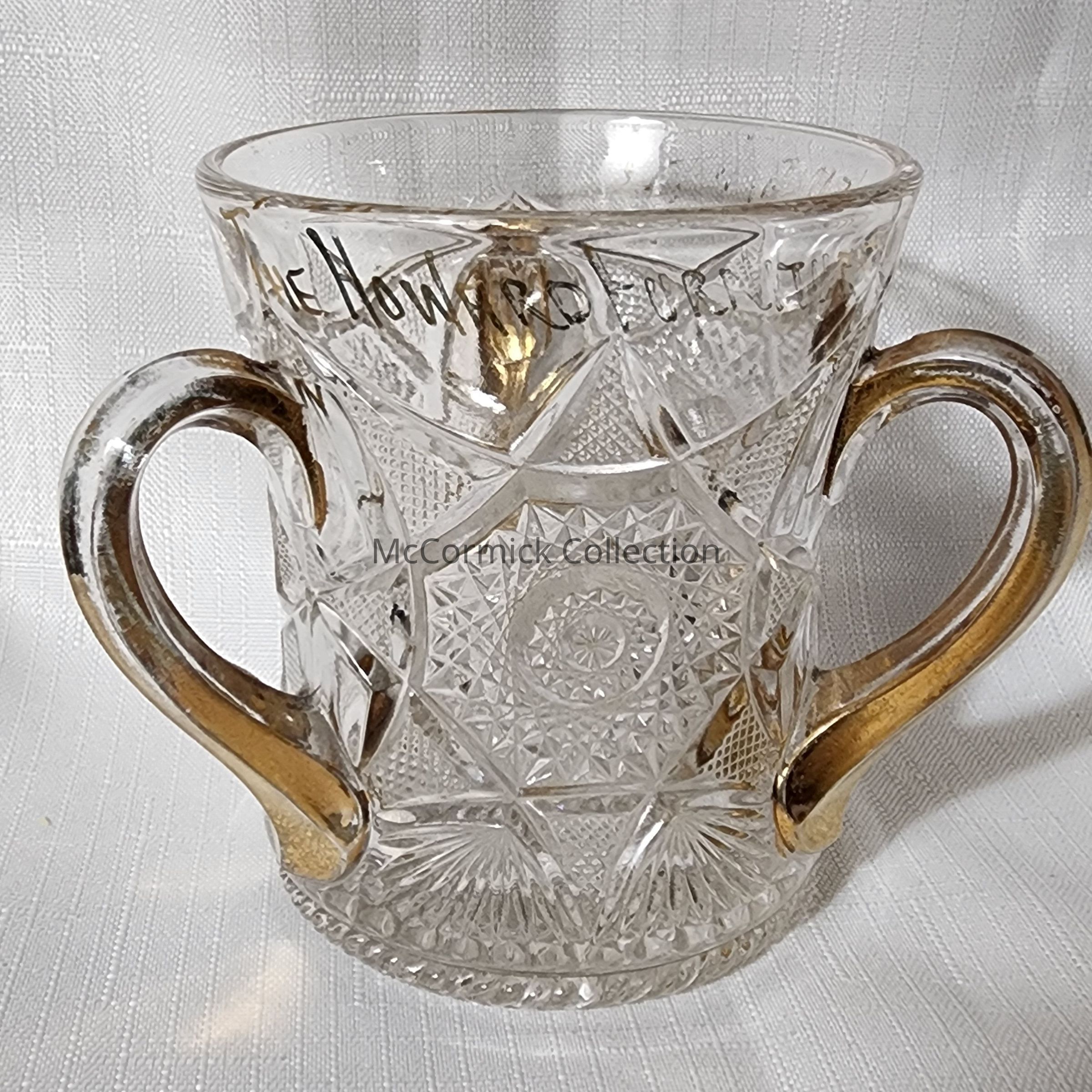 Early American Pressed Glass three handled cup from the Howard Furniture Company of Lansing.