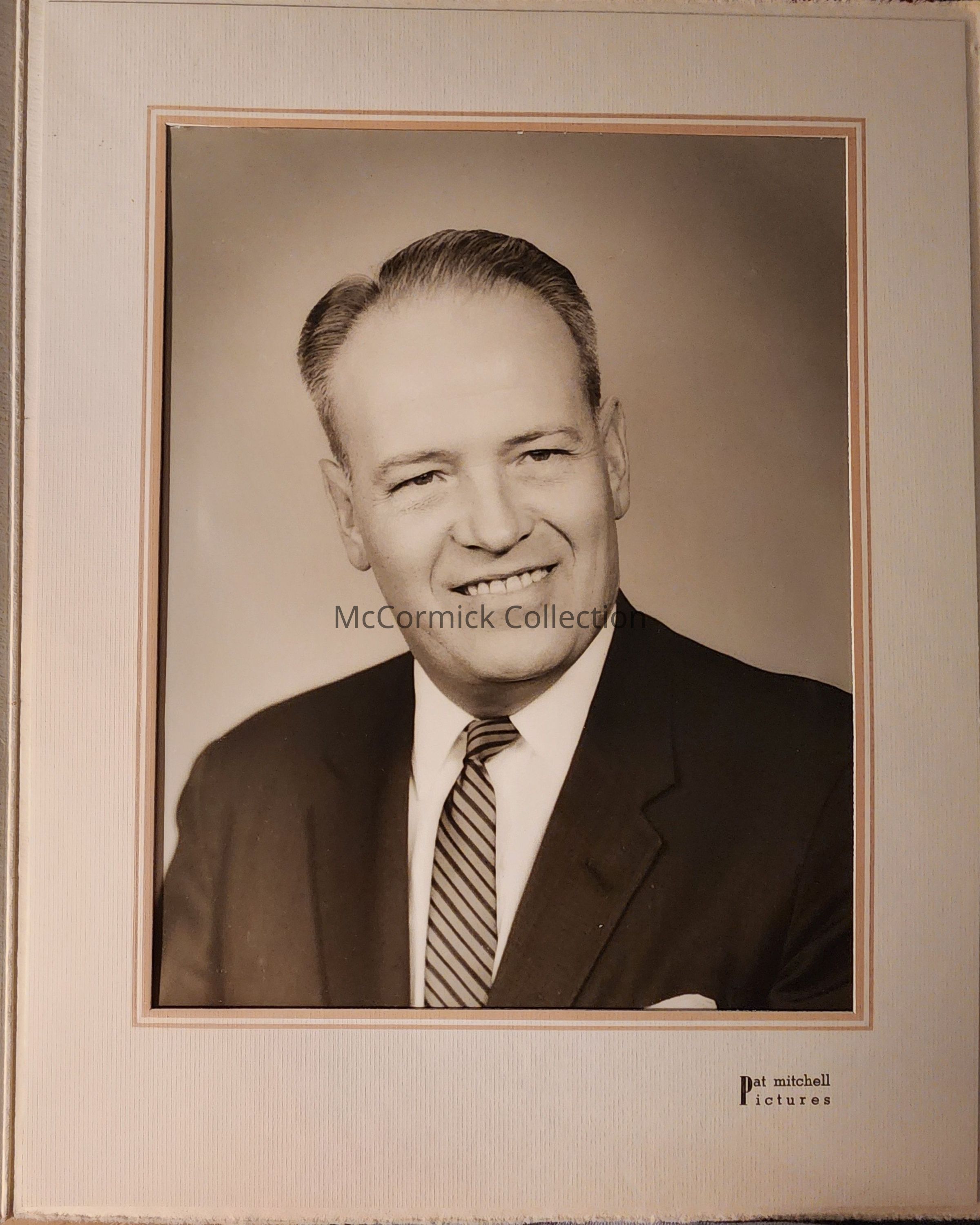 Folder mounted portrait photograph of Lansing banker Hubert Bates by Lansing photographer Pat Mitchell, circa 1950s.