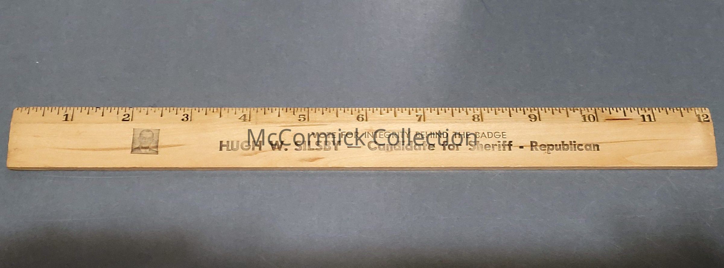 A wood campaign ruler of Hugh W. Silsby for Ingham County Sheriff. Circa 1918.
