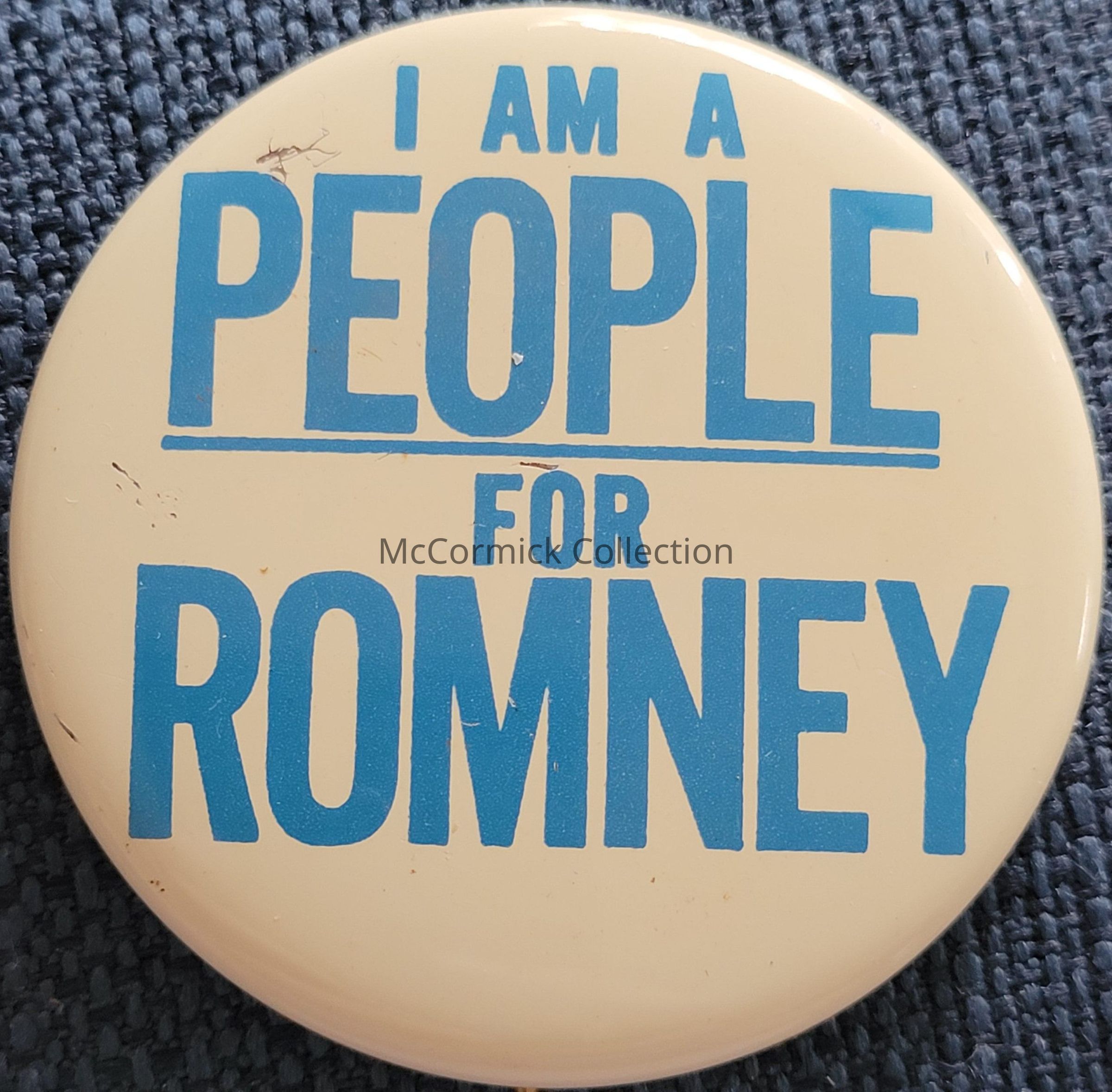 A 2.25" blue and white political button for George Romney with the slogan "I am a People for Romney."
