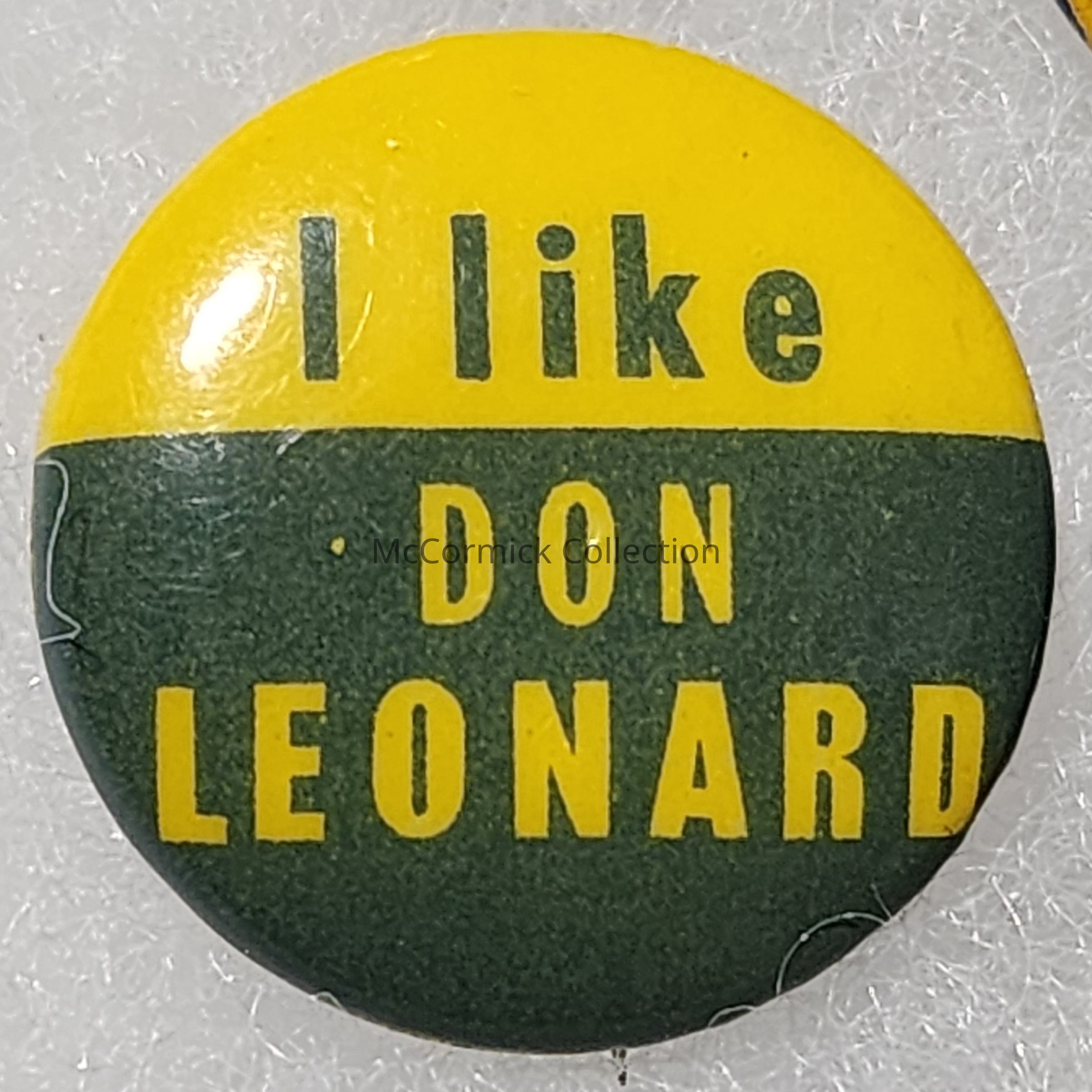 A 1" Green and yellow political button for Don Leonard for Governor, 1950s.