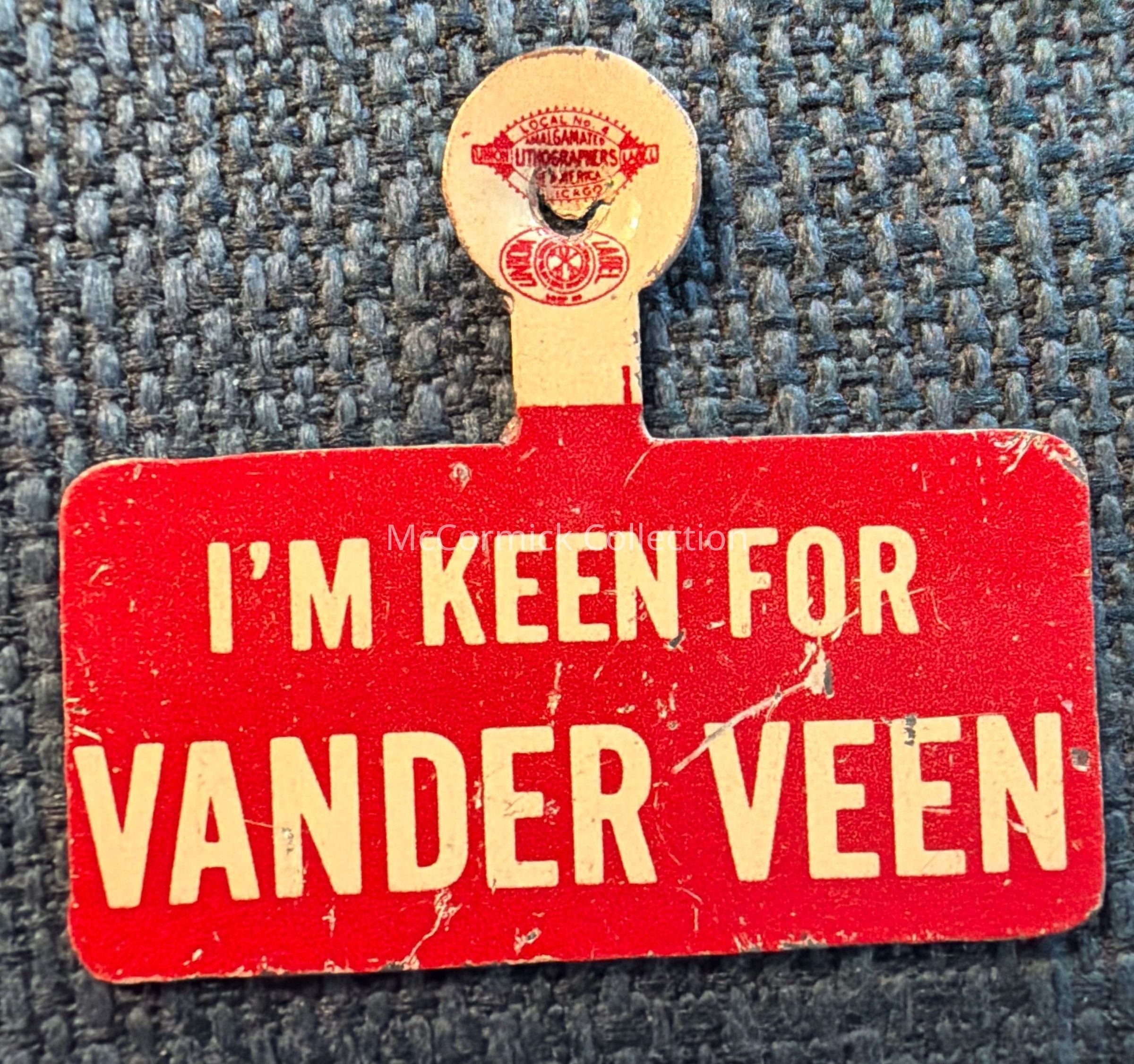 A metal political tab for Dick Vander Veen for Congress.