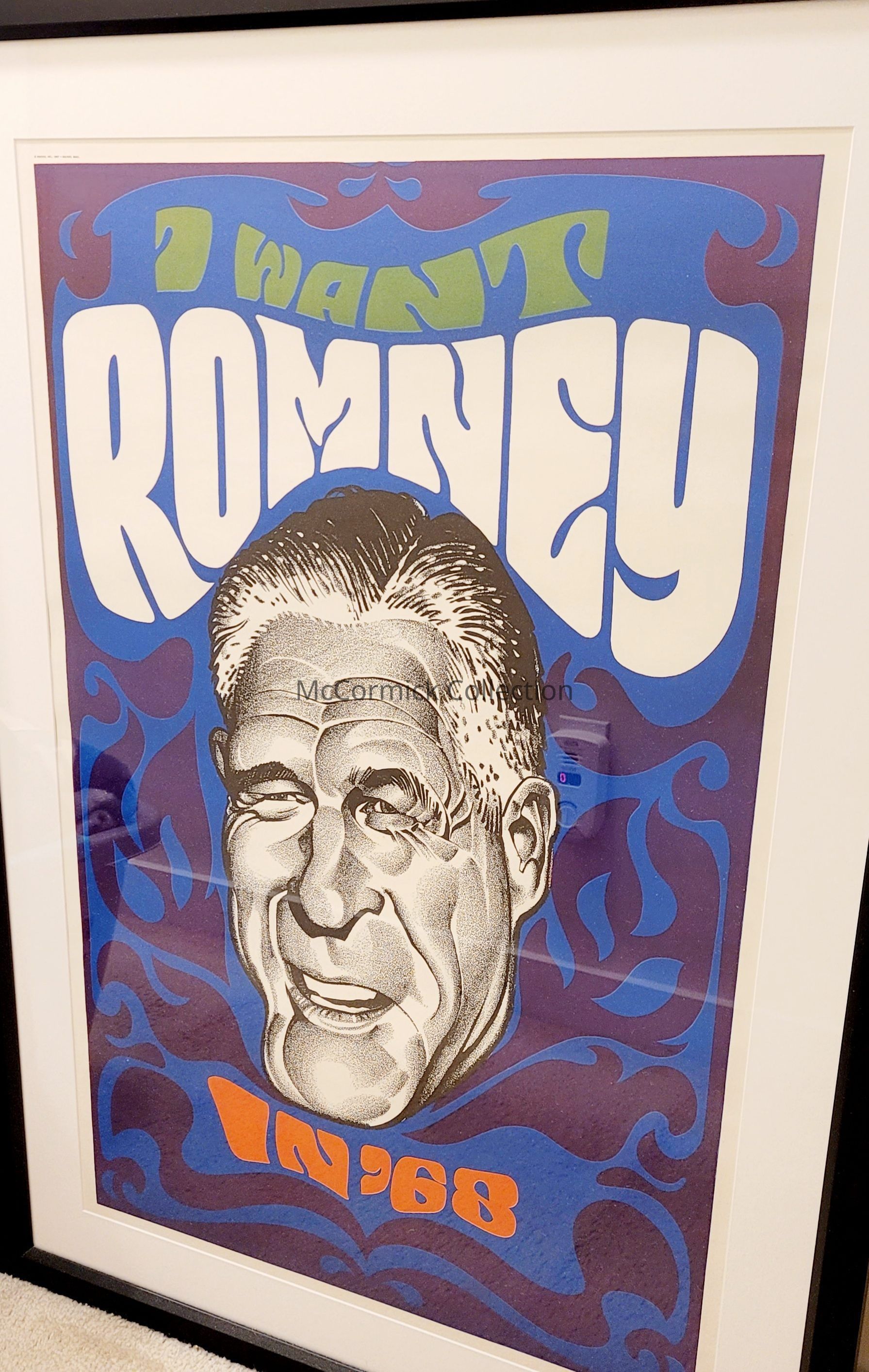 Framed poster for George Romney for President in 1968. This is from a set of campaign posters from the 1968 presidential campaign designed by Jim Trelease. Very 60's and psychedelic style.
