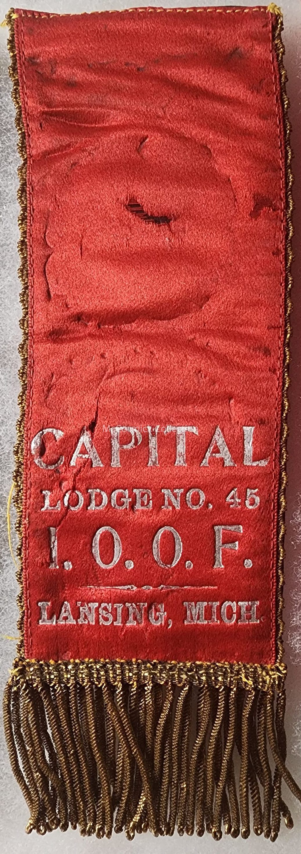 A silk badge (missing a top portion) for the Capital Lodge No. 45, Independent Order of Odd Fellows of Lansing.