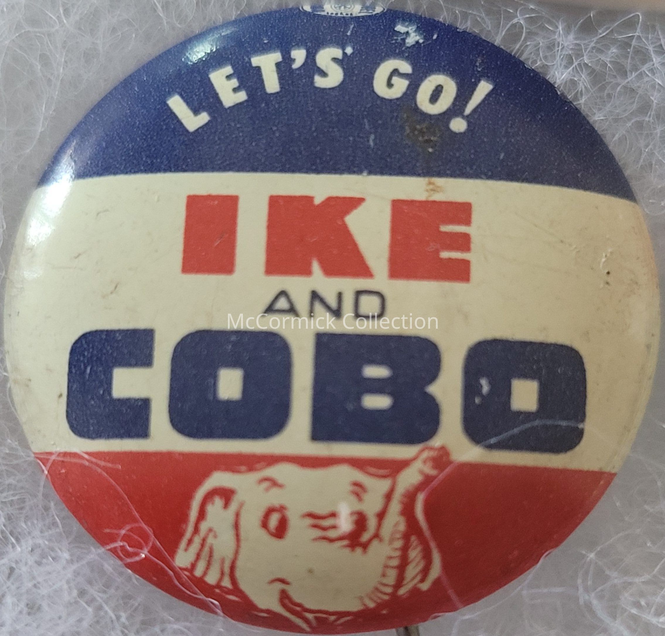 A 1" red, white, and blue political coattail button for Ike for President and Albert Cobo for Governor, 1956, using "Let's Go! Ike and Cobo" slogan.