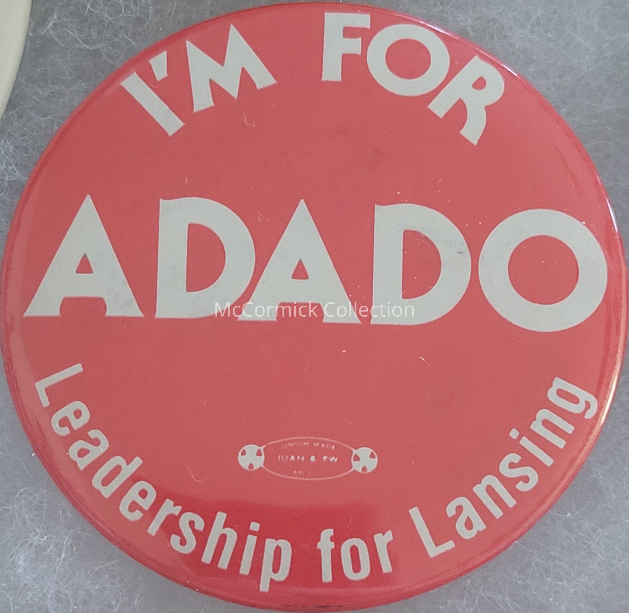 A 2.25" red and white political button "I'm for Adado Leadership for Lansing." Could be Lou Adado senior or junior, circa 1990s.