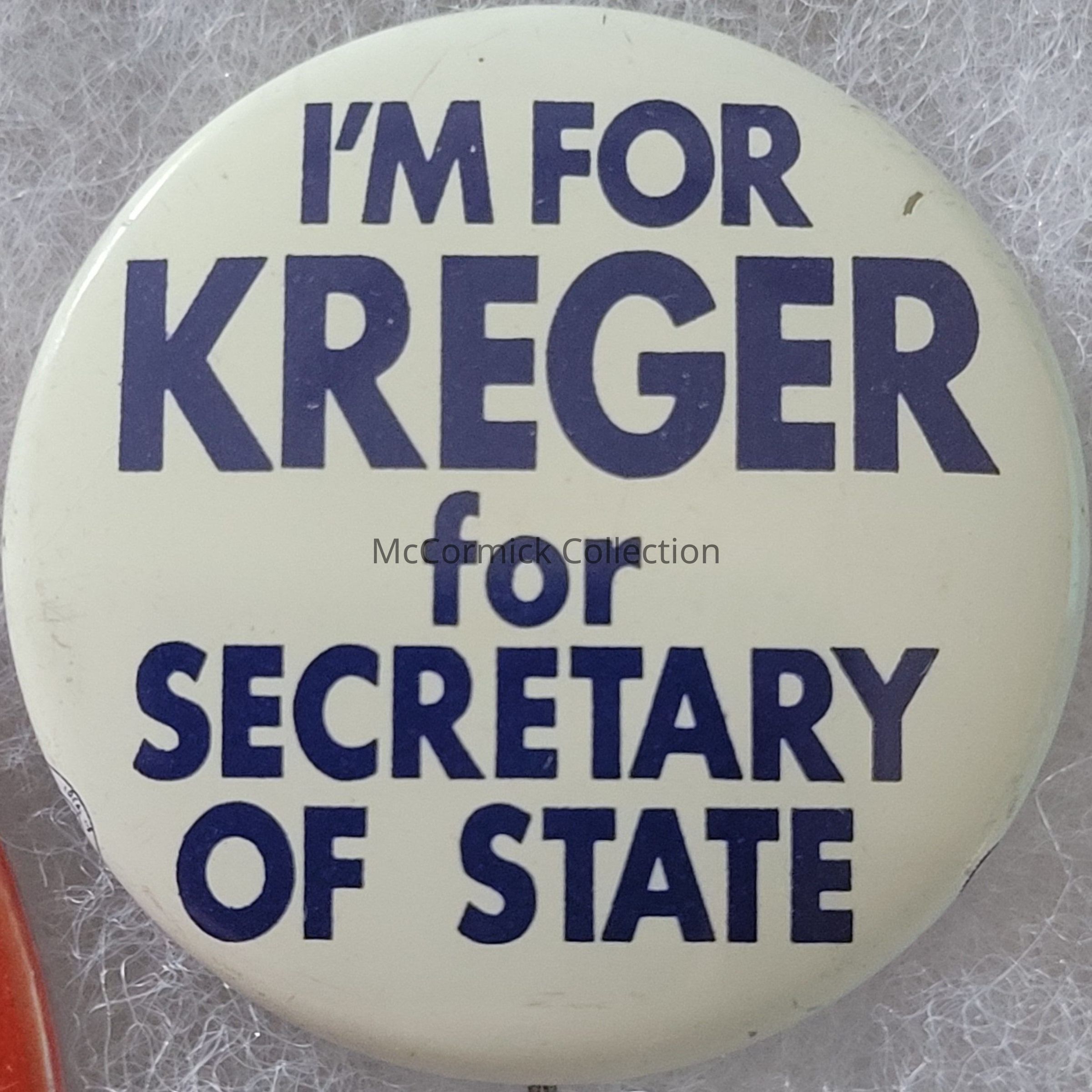 A 1.5" blue and white political button for William E. Kreger for Secretary of State, 1960.