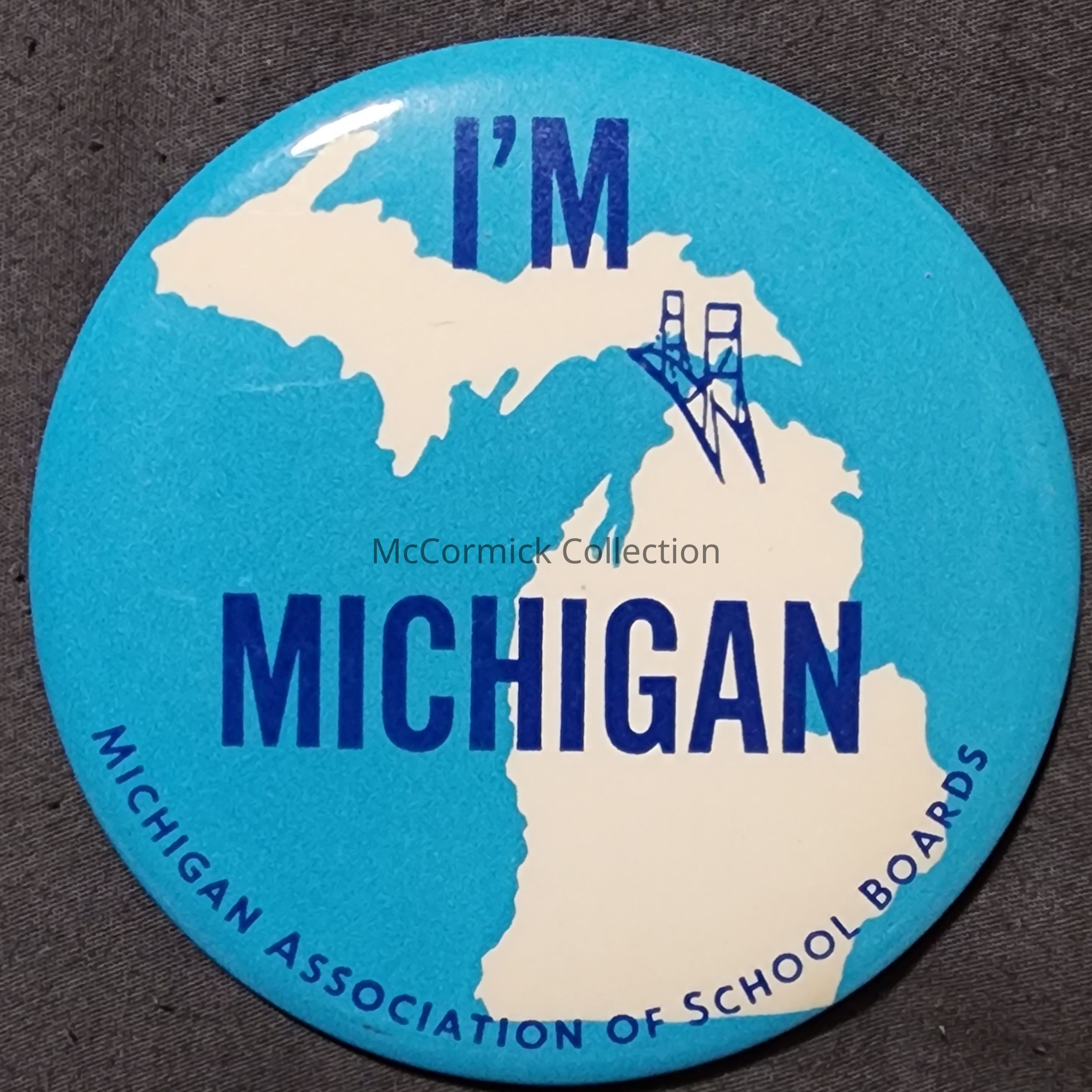 A 3.5" button for the Michigan Association of School Boards, featuring the State outline, Mackinac Bridge and slogan "I'm Michigan."