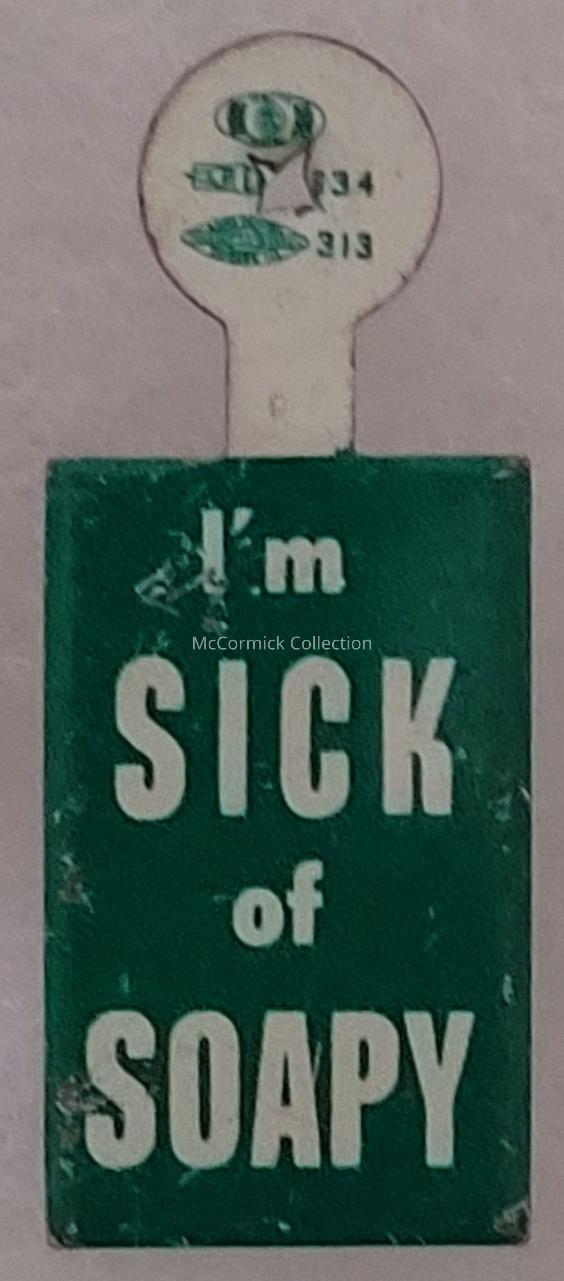 Political tab in opposition to G. Mennen Williams' terms as Governor of Michigan. It is green and white and reads: "I'm Sick of Soapy."