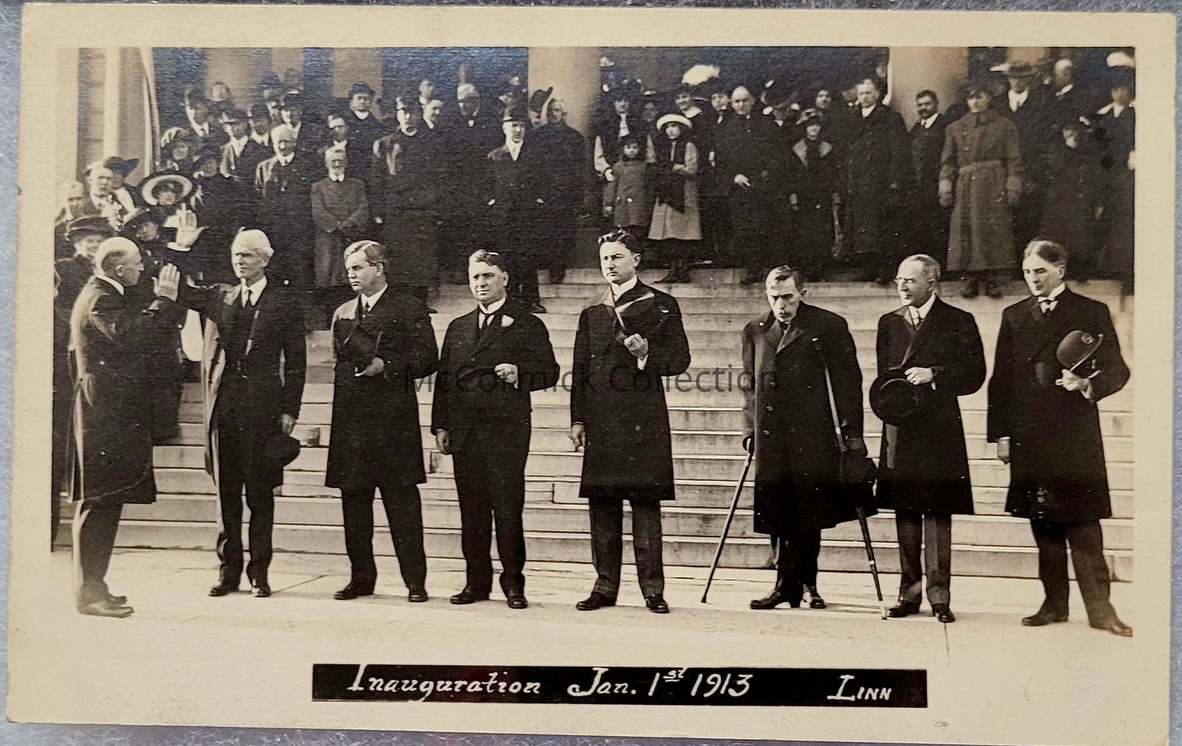 Real photo postcard of the 1913 Inauguration of Woodbridge Ferris as Governor and other executive officials on the steps of the Michigan State Capitol. Photo by Linn.