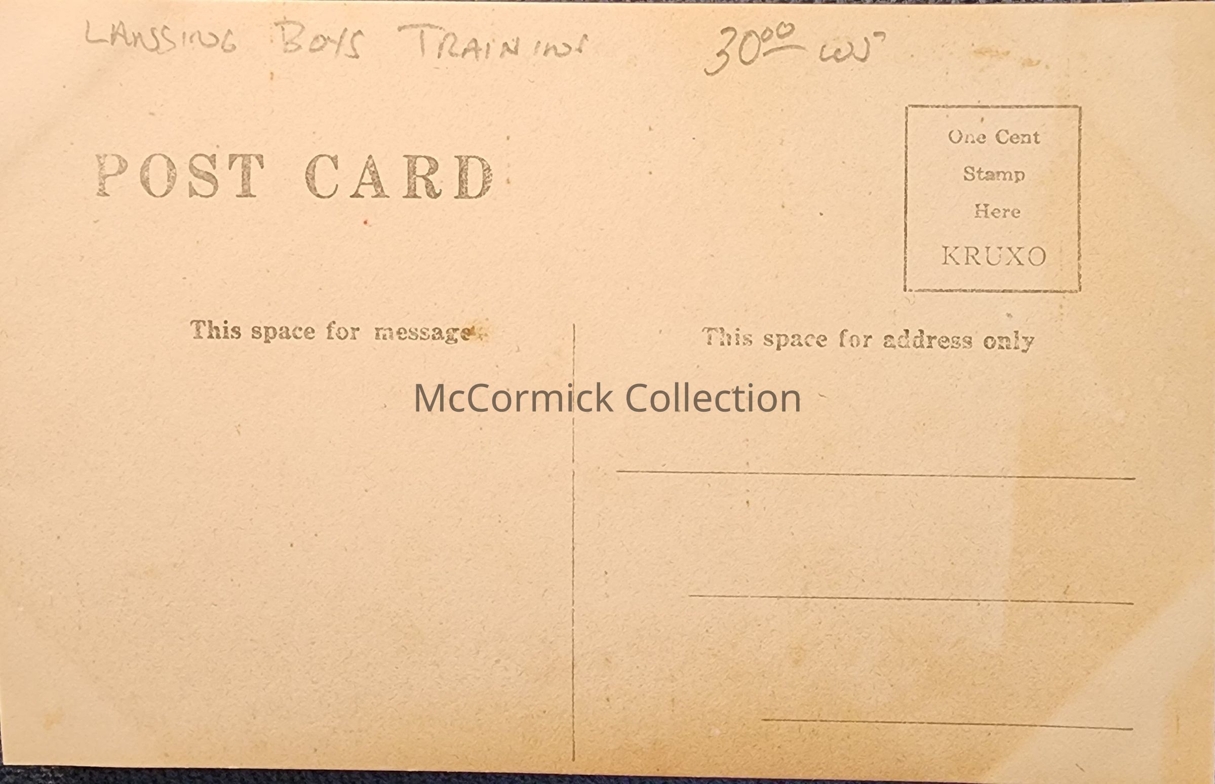 Real photo postcard of the Michigan Industrial School Band in Lansing, Michigan. Kruxo stamp box.