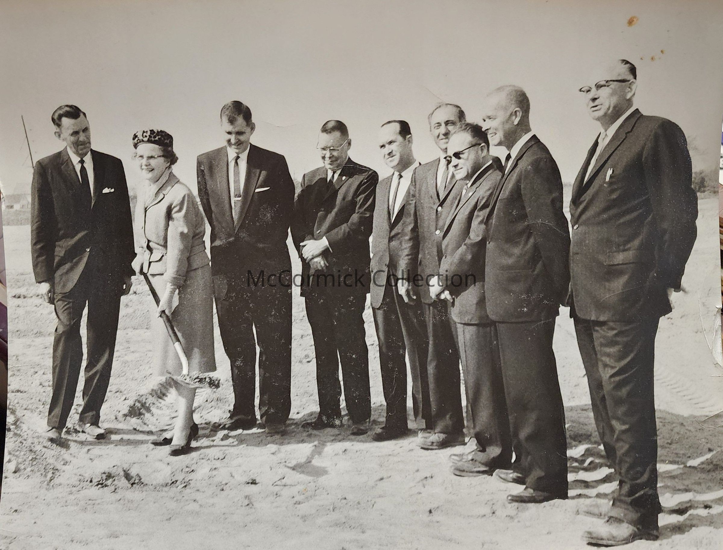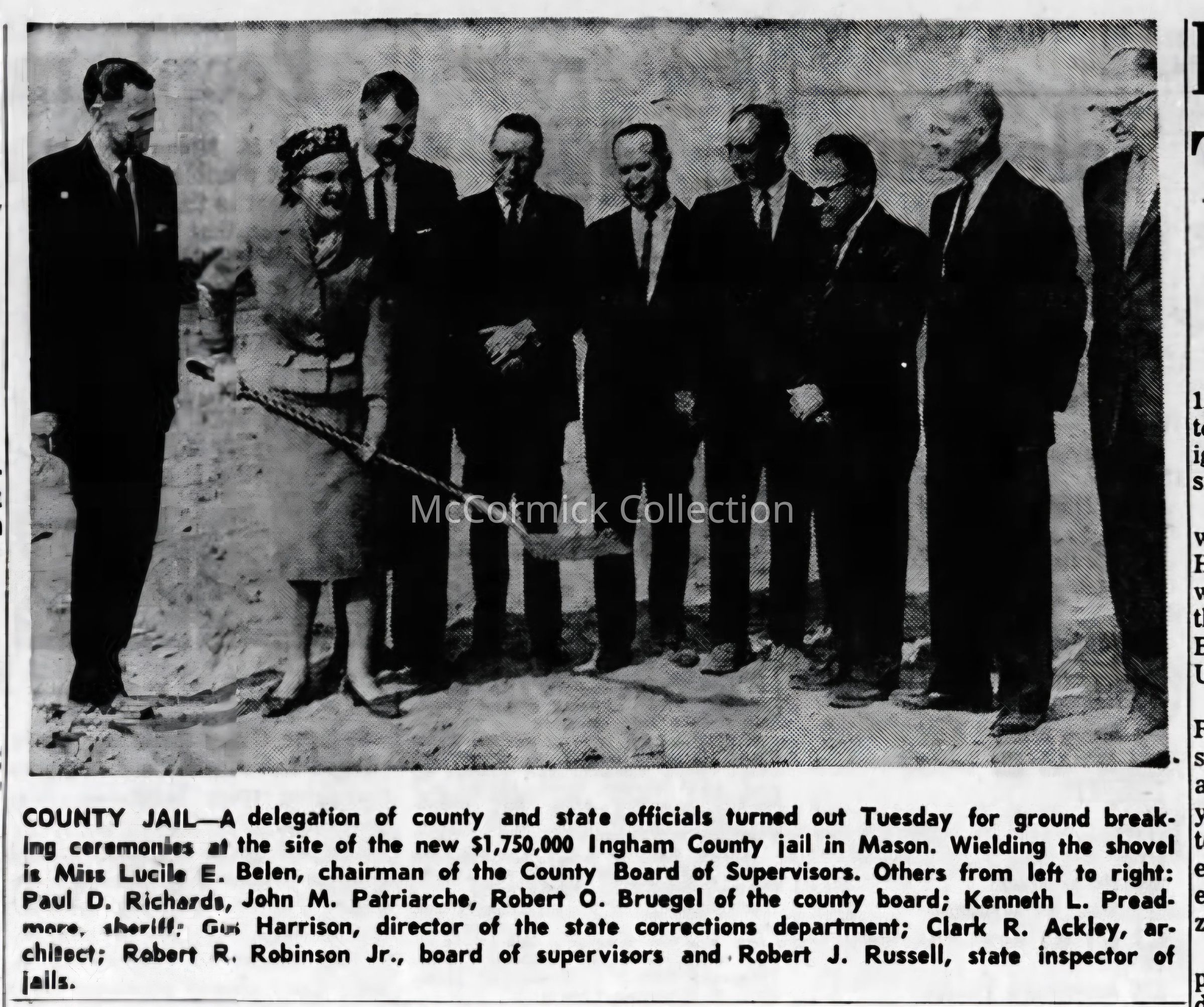 Oversize photographic print of the ground breaking of the new Ingham County Jail and Sheriff's Department in October 1963. Pictured are, left to right, Paul D.Richards, Lucille Belen, John M. Patriarche, Robert O. Bruegel, Sheriff Kenneth Preadmore, Gus Harrison, Clark Ackley, Robert Robinson, and Robert Russell.