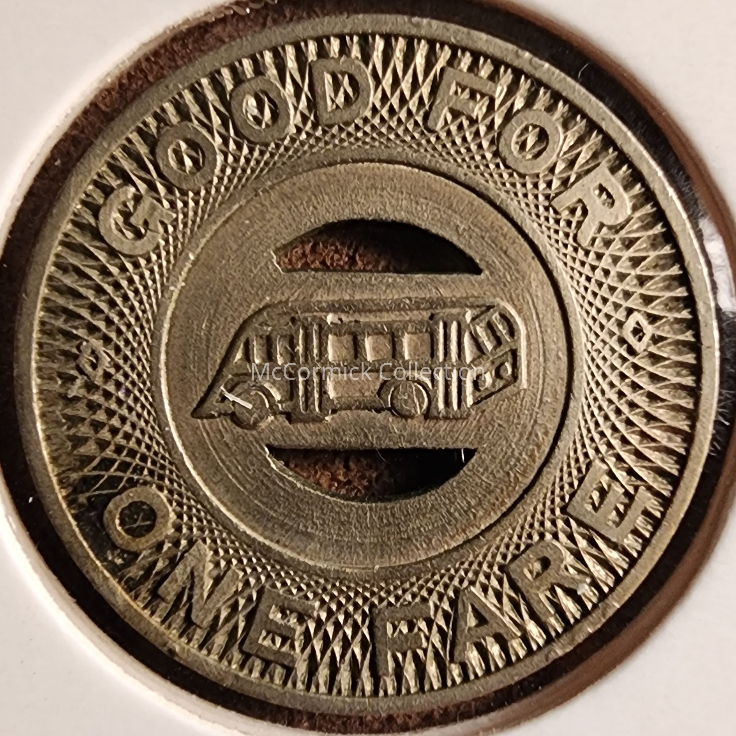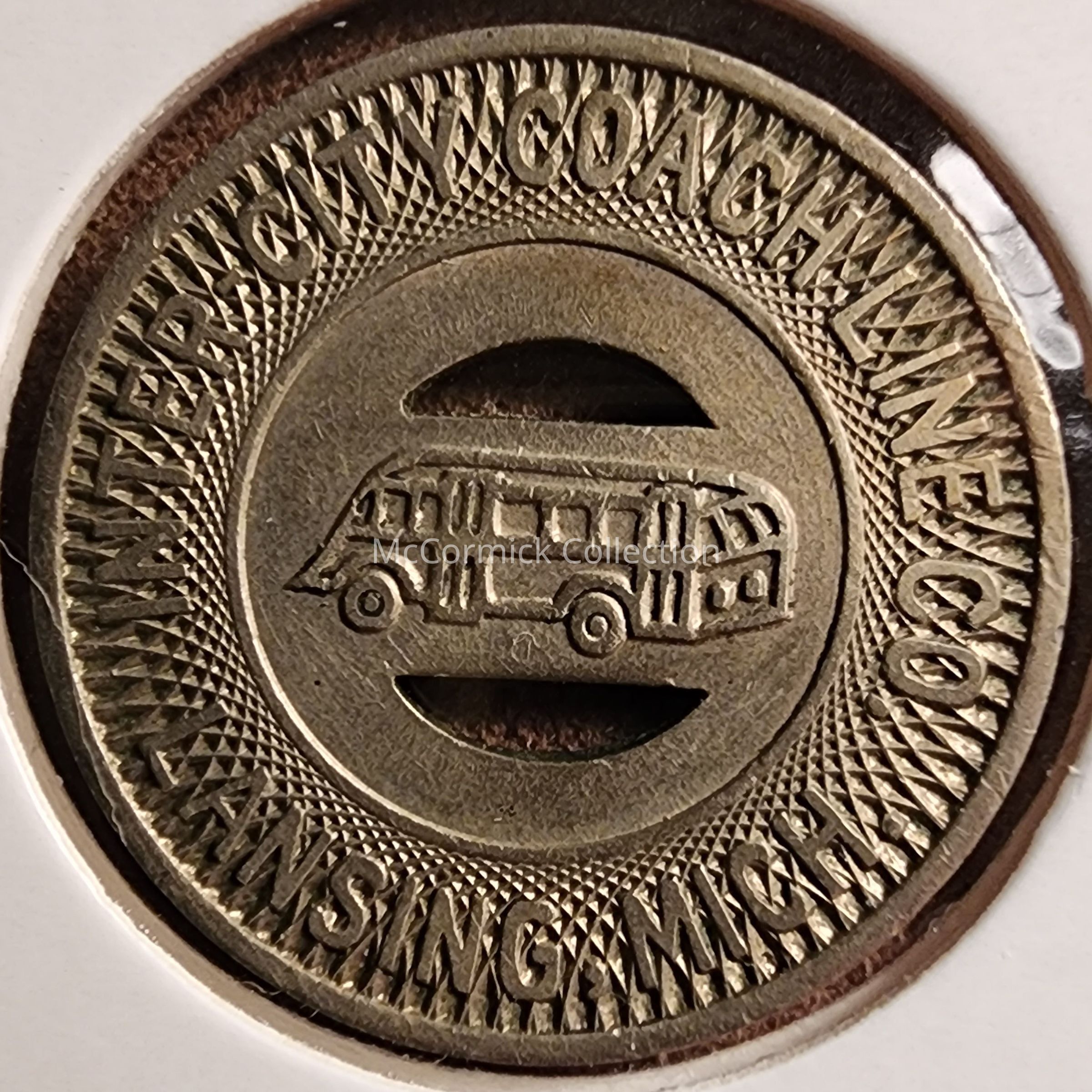 Inner City Coach Line Co., Lansing, Mich. token. Good for one fare. Bus symbol in the center. Circa 1948. Three.